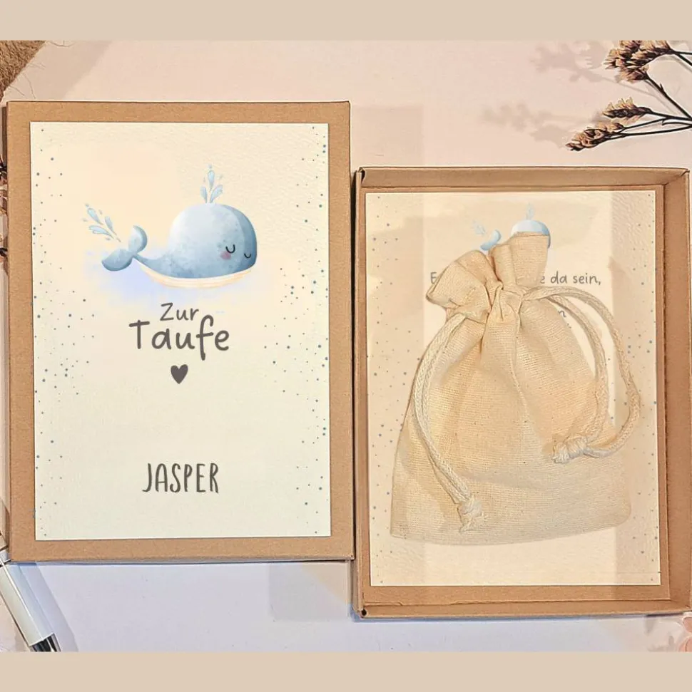 Im Inneren findest du eine fest gestaltete Taufkarte mit liebevollem Spruch und niedlicher Wal-Illustration. Zusätzlich erhältst du ein Leinensäckchen (9 x 12cm), ideal für Geldscheine, kleine Überraschungen oder symbolische Geschenke. Die Box selbst besteht aus stabilem Kraftkarton (Maße: 15,5 x 11,5 x 2,5cm) und überzeugt durch moderne Pastelltöne.