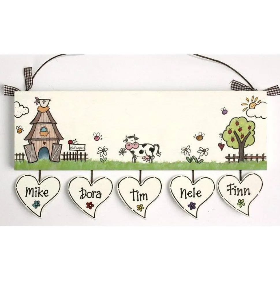 Verleihe Deinem Zuhause eine persönliche Note mit einem exklusiven Türschild aus Holz! Dieses hochwertige, handgefertigte Holztürschild ist das perfekte Willkommensschild für Deine Familie. Gefertigt aus wetterfestem Naturholz, wird das Schild individuell mit Deinem Familiennamen und bis zu sechs Herzanhängern, beschriftet mit den gewünschten Vornamen, gestaltet. Die Maße betragen 12,5 x 40 cm und eine praktische Aufhängekordel ist bereits angebracht.