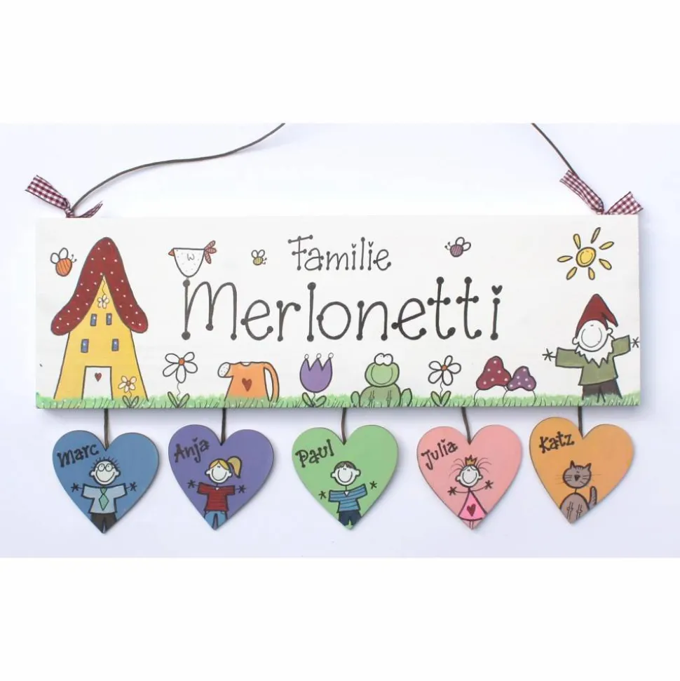 Das Namensschild bietet Platz für bis zu 6 Herzanhänger, die nebeneinander montiert werden. Jeder Anhänger wird in Deiner Wunschfarbe gestaltet, mit den Vornamen beschriftet und individuell mit Wunschfigur bemalt. Geliefert wird das Holzschild mit einer praktischen Aufhängekordel – ein echter Blickfang an jeder Haustür!