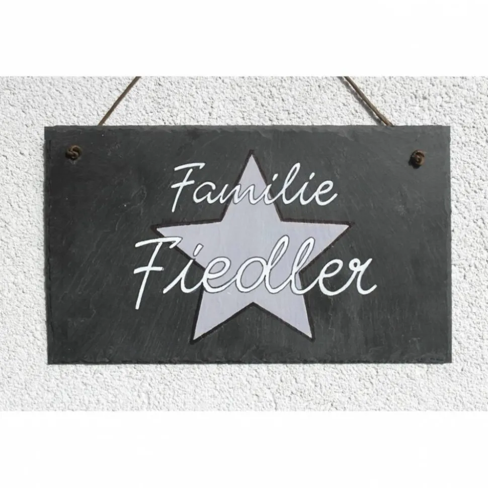Dieses handgemachte Haustürschild wird individuell für dich gestaltet und vereint Natürlichkeit mit zeitloser Eleganz. Das Schieferschild ist mit einem großen Stern in dezentem braugrau/mauve handbemalt und wird zweizeilig mit deinem Familiennamen in deiner Wunschschriftart beschriftet. Die Beschriftung erfolgt in stilvollem Weiß – so wird jedes Schild zum einzigartigen Unikat.