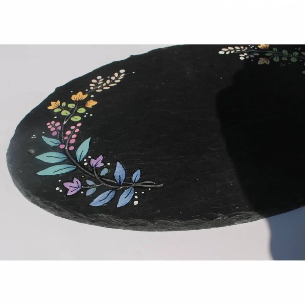 Der Schiefer wird mit speziellem Schieferöl vorbehandelt, poliert und künstlerisch bemalt. Schiefer ist ein 100% Naturprodukt und macht jedes Türschild durch natürliche Unregelmäßigkeiten zu einem echten Unikat.