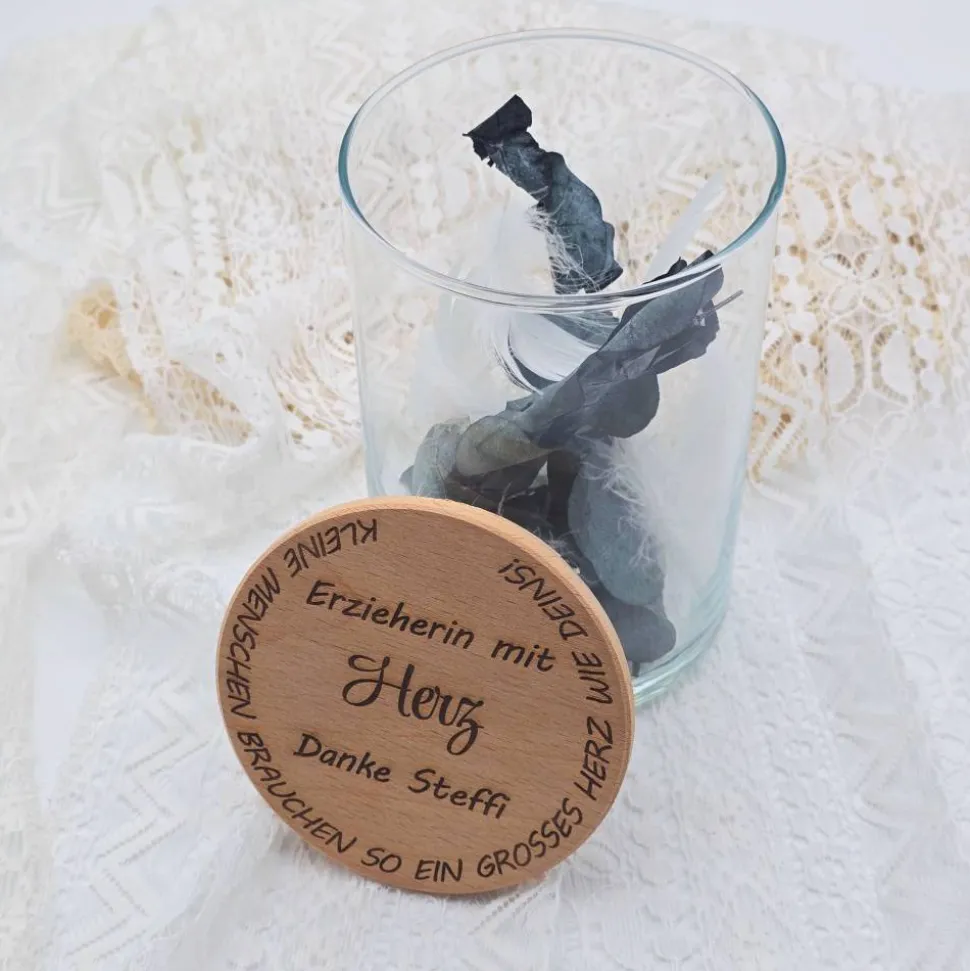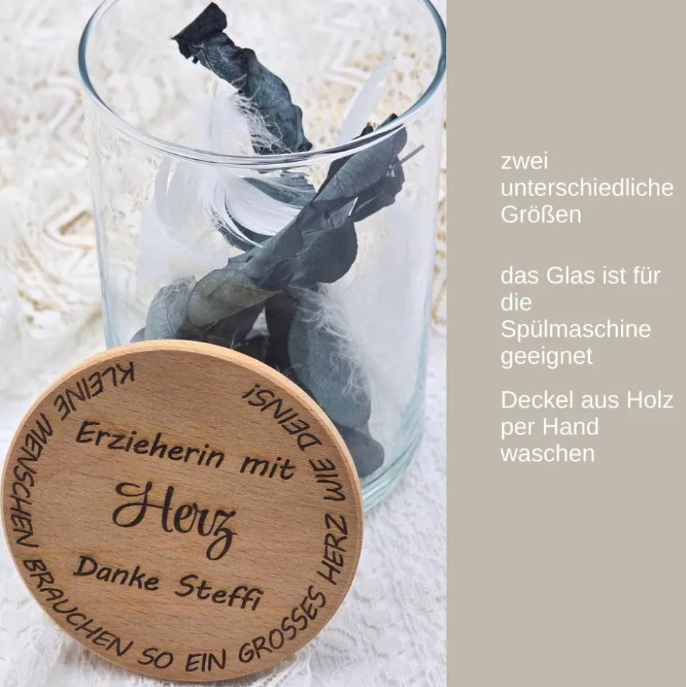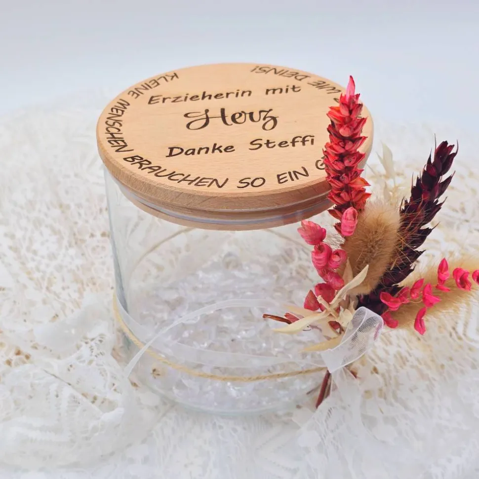 Entdecke unser charmantes personalisiertes Vorratsglas mit Holzdeckel, ein ideales kleines Dankeschön und Abschiedsgeschenk für den Kindergarten oder deine liebevolle Hebamme. Dieses vielseitige Glas ist nicht nur funktional, sondern auch ein dekoratives Element für jede Küche. Mit einem eleganten Trockenblumenstrauß dekoriert und deiner Personalisierung (Sofern ein bestimmter Spruch gewünscht wird, schreibe uns hierzu gerne an) wird es zu einem einzigartigen Andenken, das in Erinnerung bleibt. Perfekt, um einem besonderen Menschen in deinem Leben eine Ideen für Befüllung: trockene Lebensmittel wie z.B. Nudeln, Kekse…, Trockenblumen, Gutscheine