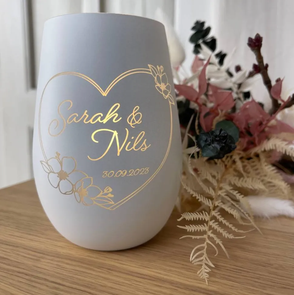 Durch die Gravur schimmert das Kerzenlicht in der gewählten Beschichtung.