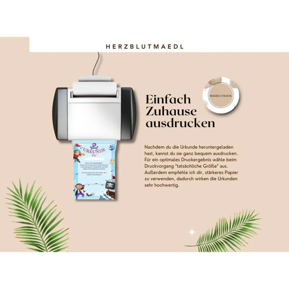 Farbabweichungen sind aufgrund unterschiedlicher Drucker möglich. Sieh am besten für ein optimales Farbergebnis in die Einstellungen deines Druckers. Viele Drucker haben einen Randbereich, der frei bleibt. Damit die Urkunde komplett ausgedruckt wird, wähle im Druckfenster unter dem Abschnitt „Seite anpassen“ die Option „Anpassen“. Dann wird alles von der Urkunde sichtbar sein. Der weiße Rand lässt sich bei haushaltsüblichen Druckern leider nicht verhindern.