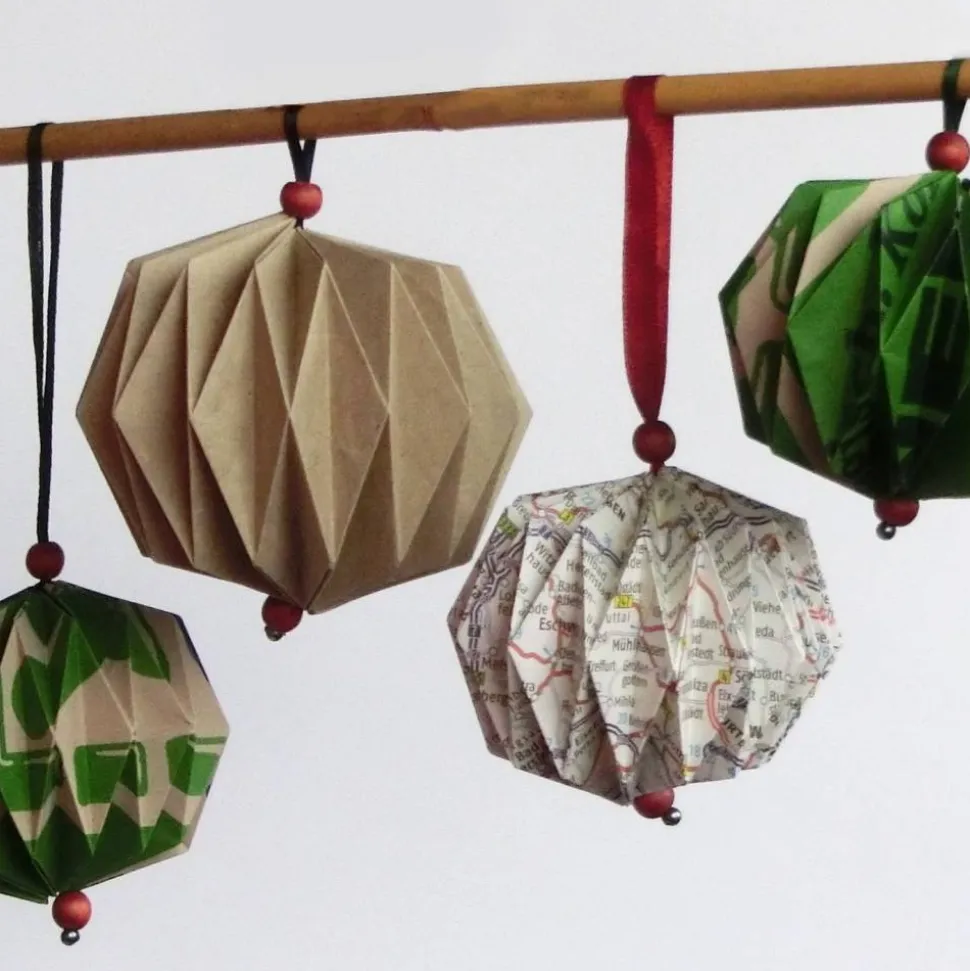 Die Weihnachtskugeln eignen sich als Baumschmuck oder fürs Fenster oder den Raum. Sie bestehen aus verschiedenem Upcycling-Papier wie Packpapier, Papiereinkaufstüten, Landkarten oder Flyern