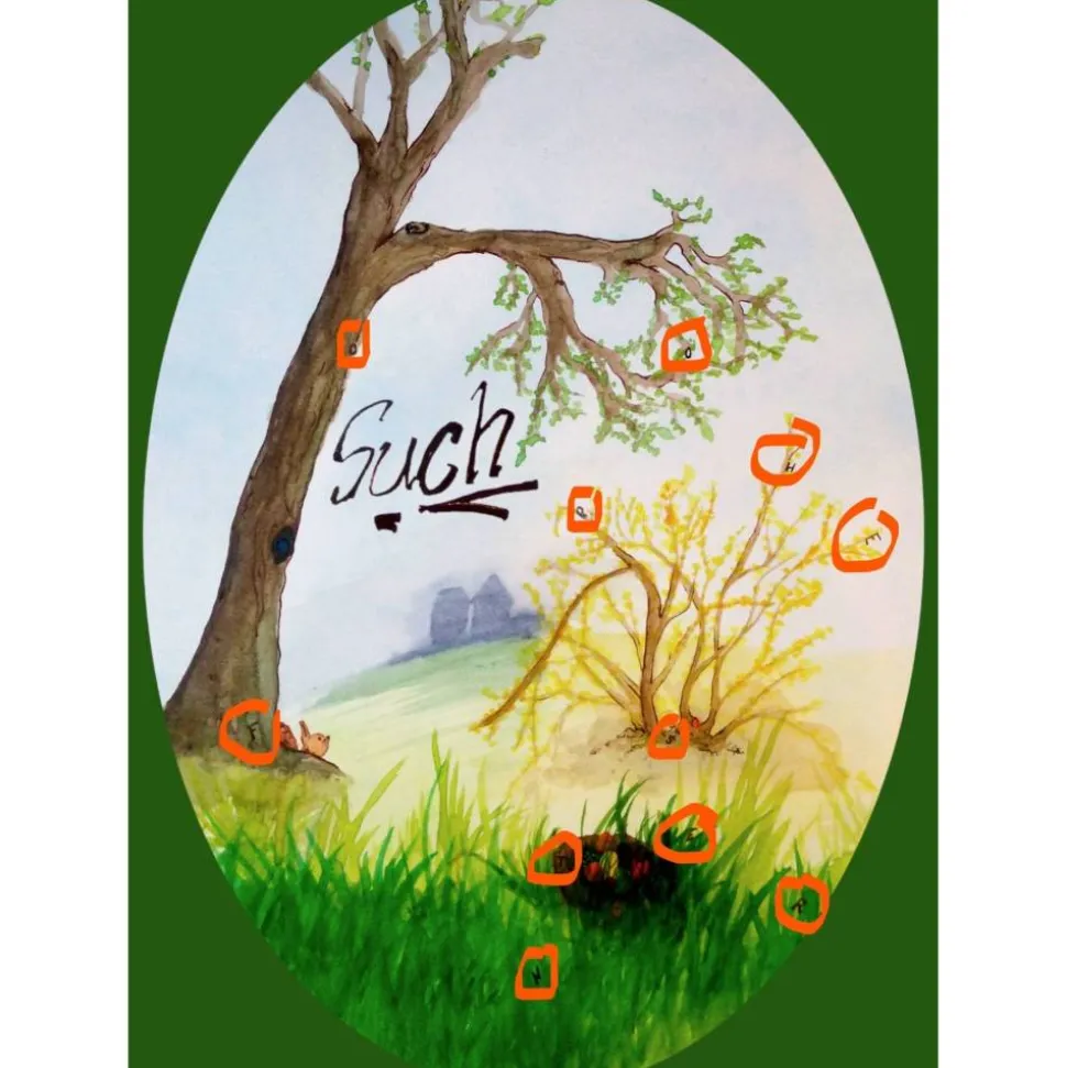 ‚FROHE OSTERN‘ jeder Buchstabe ist irgendwo im Bild zu finden.