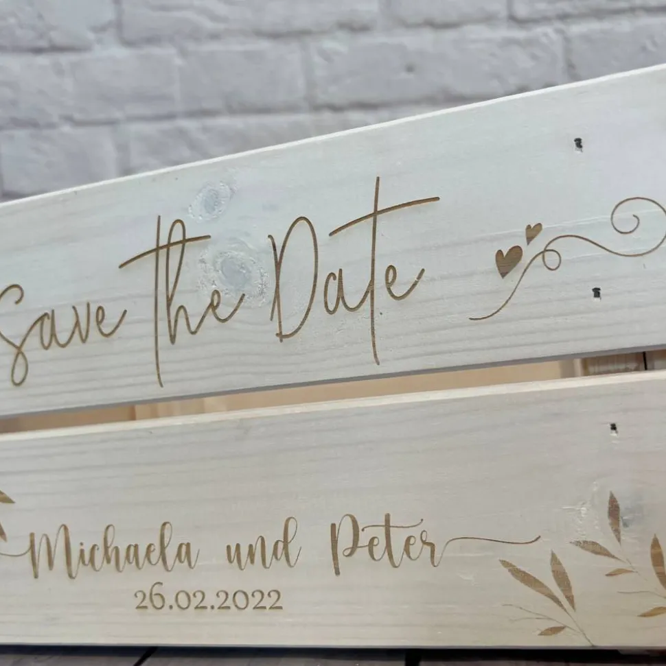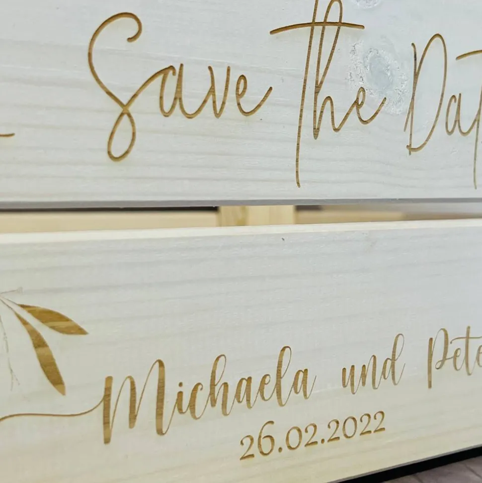 Deine liebevollen Worte werden auf die Aufbewahrungskiste graviert und in Verbindung mit kleinen Geschenken wird die Hochzeit unvergesslich.
