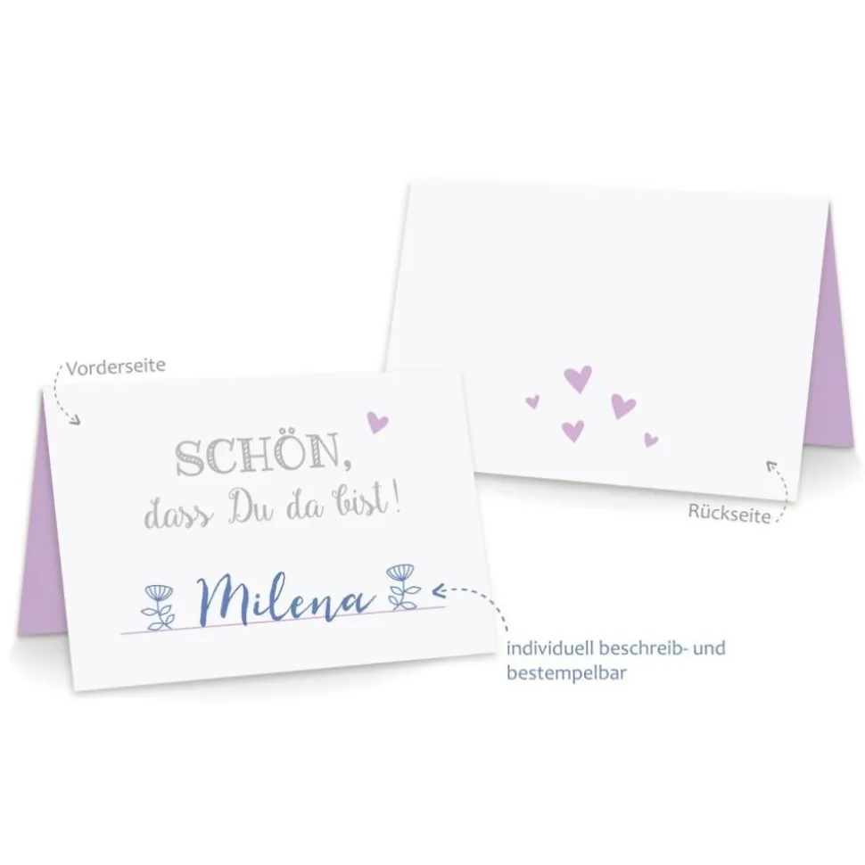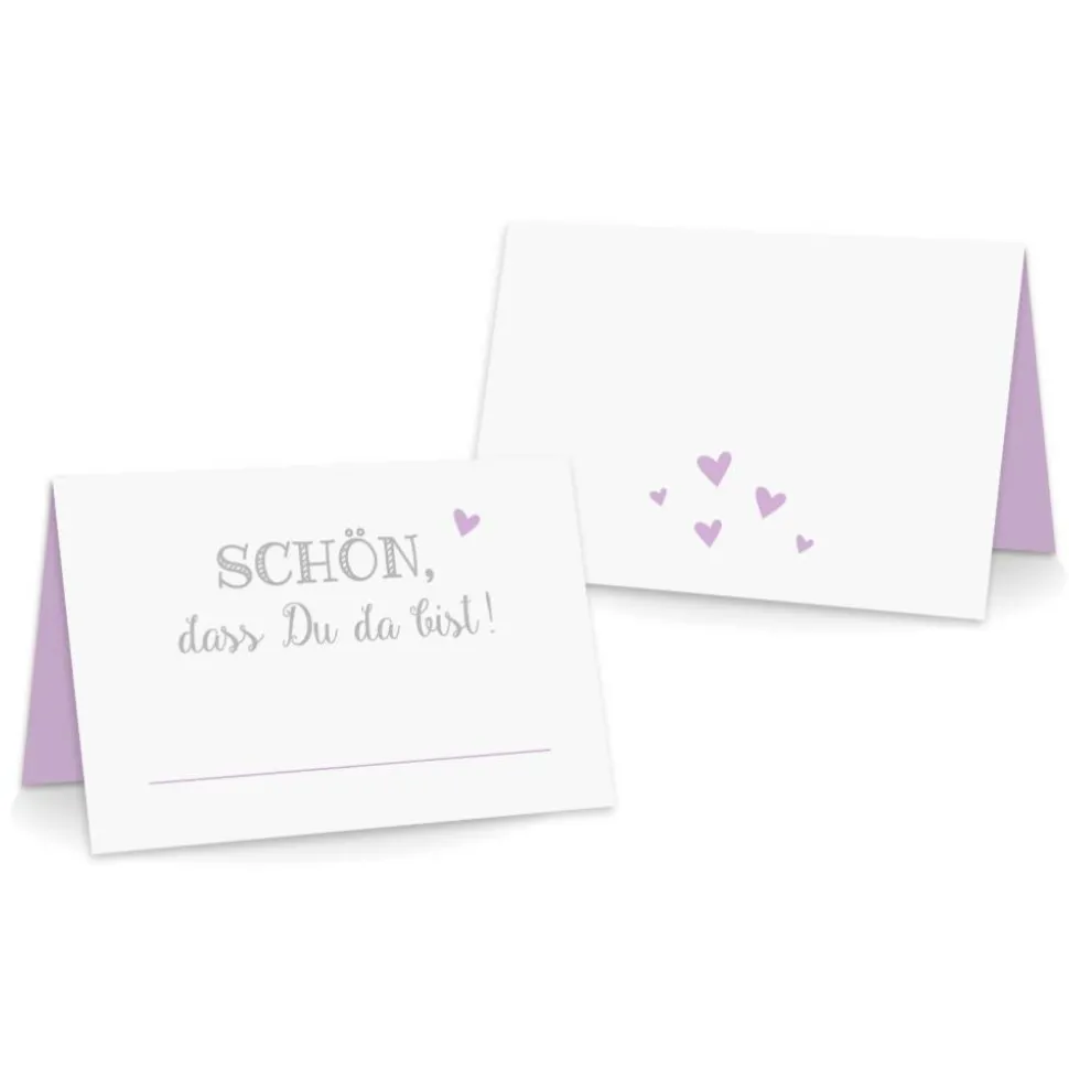 Premium Tischkarten aus hochwertigem und stabilem Papier mit sehr schönem Aufdruck in Schrift-grau Herzen-flieder.