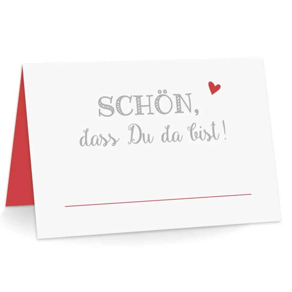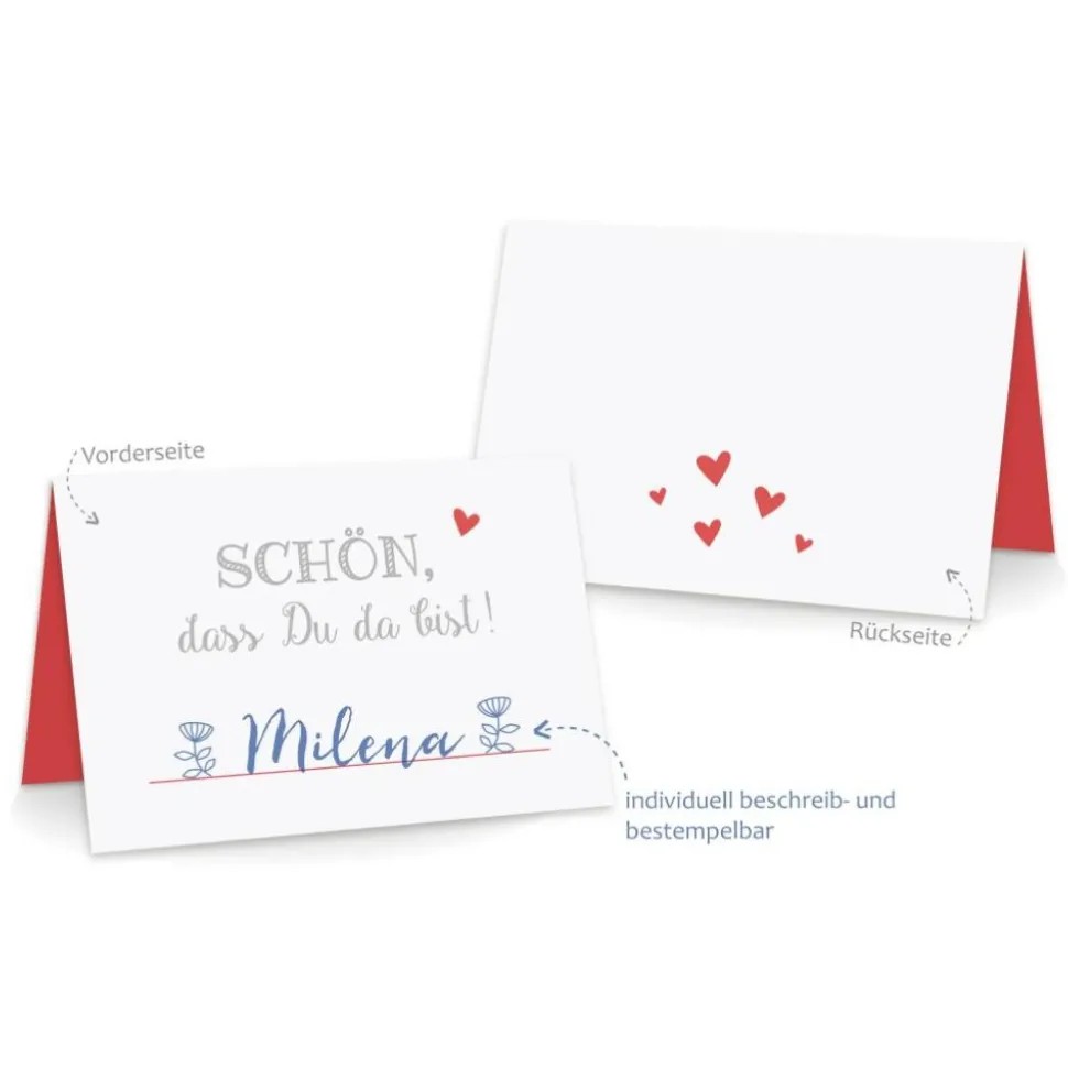 Premium Tischkarten aus hochwertigem und stabilem Papier mit sehr schönem Aufdruck in Schrift-grau Herzen-rot.