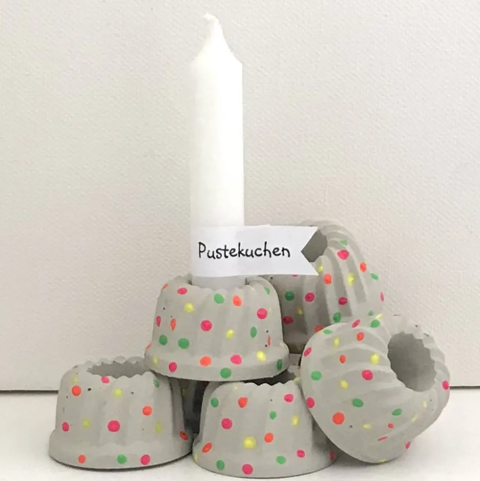 Sie sind aus Beton gefertigt und liebevoll mit neonfarbenen Pünktchen verziert. Der Kauf beinhaltet neben einer kleinen Kerze auch die Banderole „Pustekuchen“.
