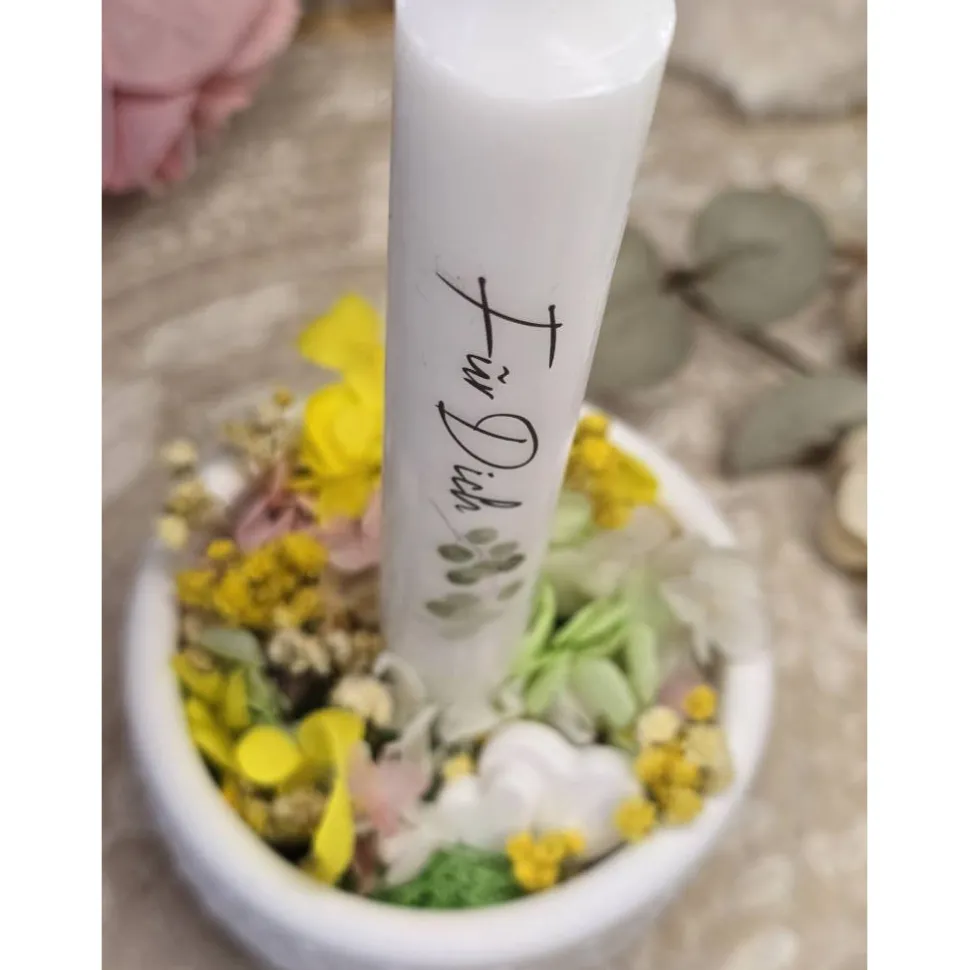 Einzigartige Geschenkidee: Die Kombination aus schlichter Raysin-Schale, natürlichen Trockenblumen und persönlichem Kerzengruß macht dieses Set zur idealen Aufmerksamkeit für besondere Menschen – als Geschenk oder Mitbringsel.