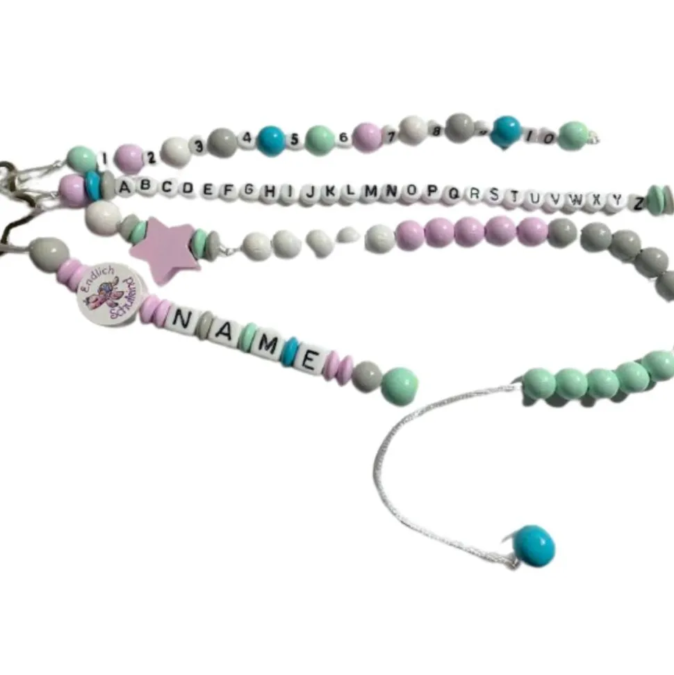 Verwendete Materialien: Holzperlen, Motivperlen, Kunststoffbuchstaben, PP Kordel, Schlüsselring