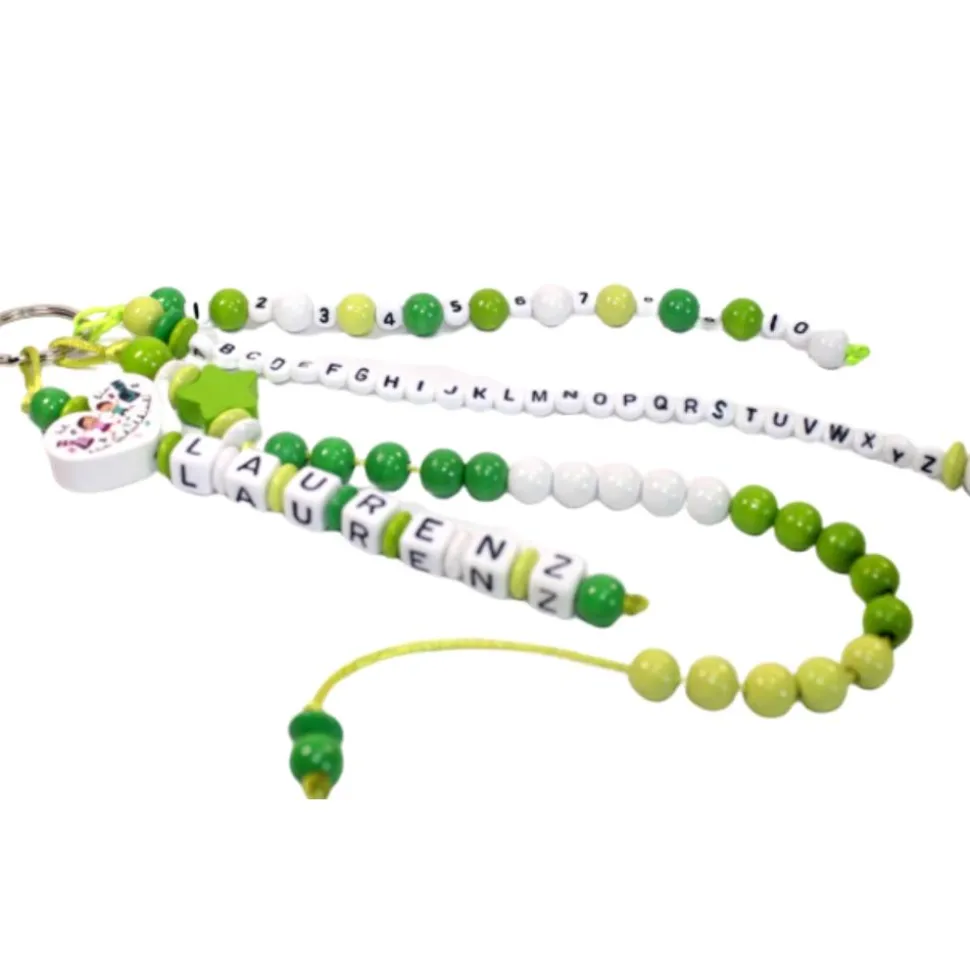 Verwendete Materialien: Holzperlen, Motivperlen, Kunststoffbuchstaben, PP Kordel, Schlüsselring