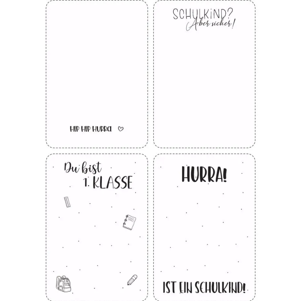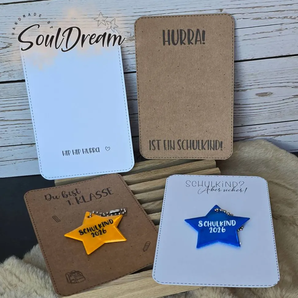Die bunten Sternen können wahlweise mit `SCHULKIND`, `SCHULKIND Jahreszahl` oder auch dem Namen des Kindes personalisiert werden. Die Rückseite der mitgelieferten Karte ist blanko und kann beschriftet werden. Karten können auf weißem Papier oder braunem Kraftkarton mit verschiedenen Sprüchen ausgesucht werden. Solltest du Sonderwünsche haben oder einen Artikel in größerer Stückzahl benötigen, kontaktiere mich gerne.