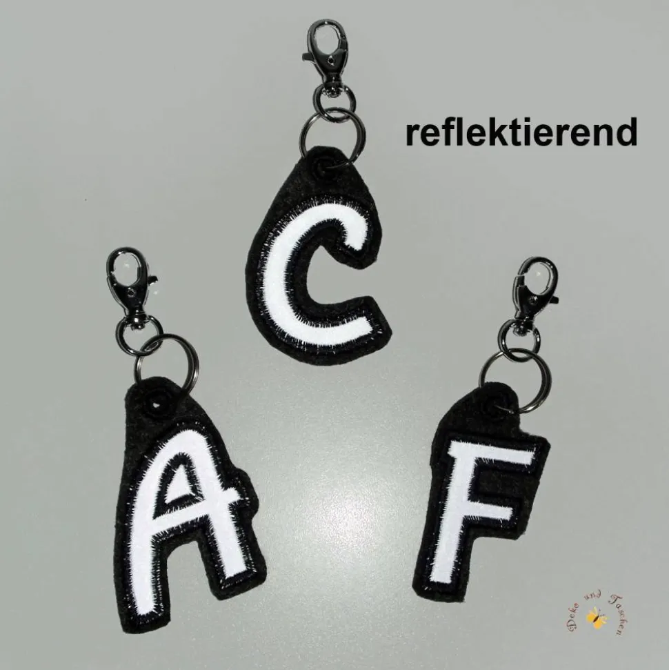 Anhänger mit beidseitiger reflektierender Applikation, gestickt auf schwarzem Filz. Für Schulkinder, Kindergartenkinder, Erwachsene oder auch Hunde, die im Dunkeln unterwegs sind. Trifft Licht auf den Stoff, so reflektiert dieser und leuchtet sehr hell. Als Anhänger am Schulranzen, an der Kindergartentasche, am Sportbeutel oder an der Kleidung verleiht er zusätzliche Sicherheit.