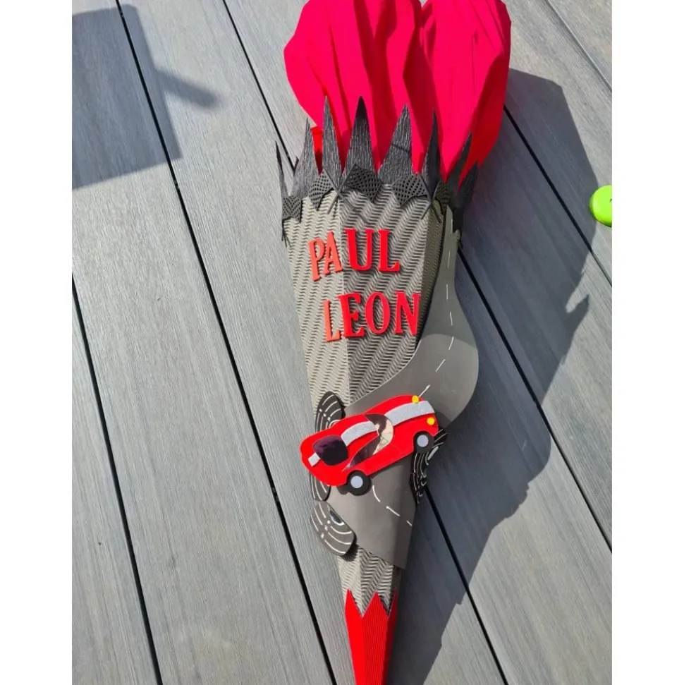 Eine Schultüte für schnelle Kids. Ein Rennauto in Glitzer oder ohne. Wie das Schulkind es möchte.