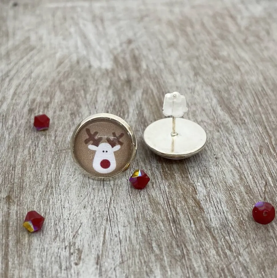 Diese hübschen Ohrstecker – Motiv: weißes Rentier aufbraun – haben eine silberfarbene Fassung. Sie sind mit Silikonstoppern versehen.
