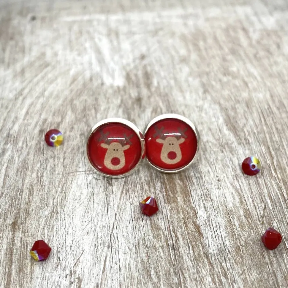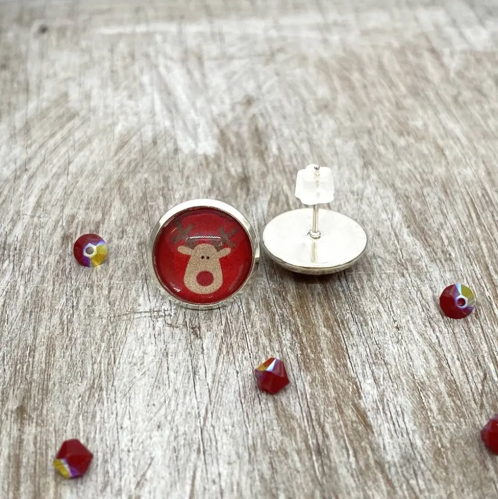 Diese niedliche Cabochon-Ohrstecker – Motiv: kleines Rentier auf rot – haben eine silberfarbene Fassung. Sie sind mit Silikonstoppern versehen.