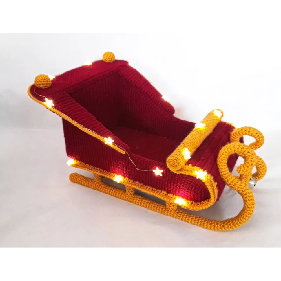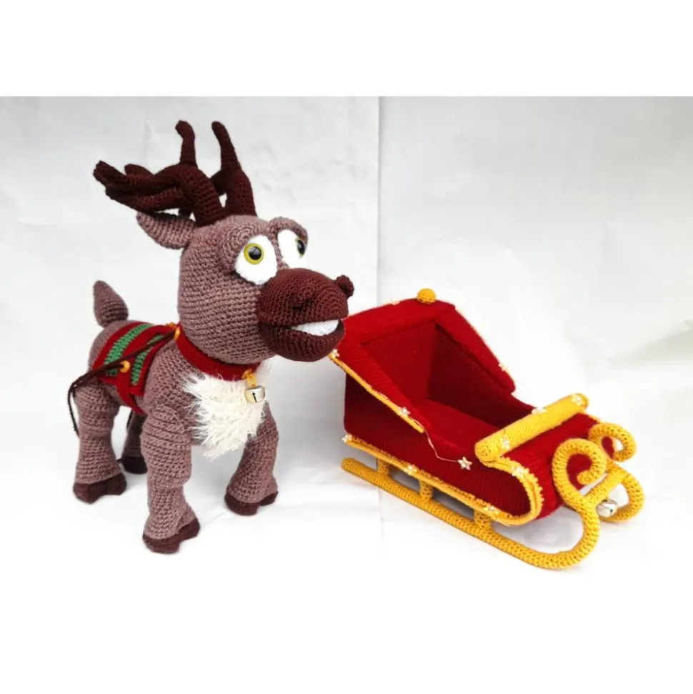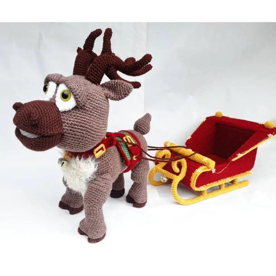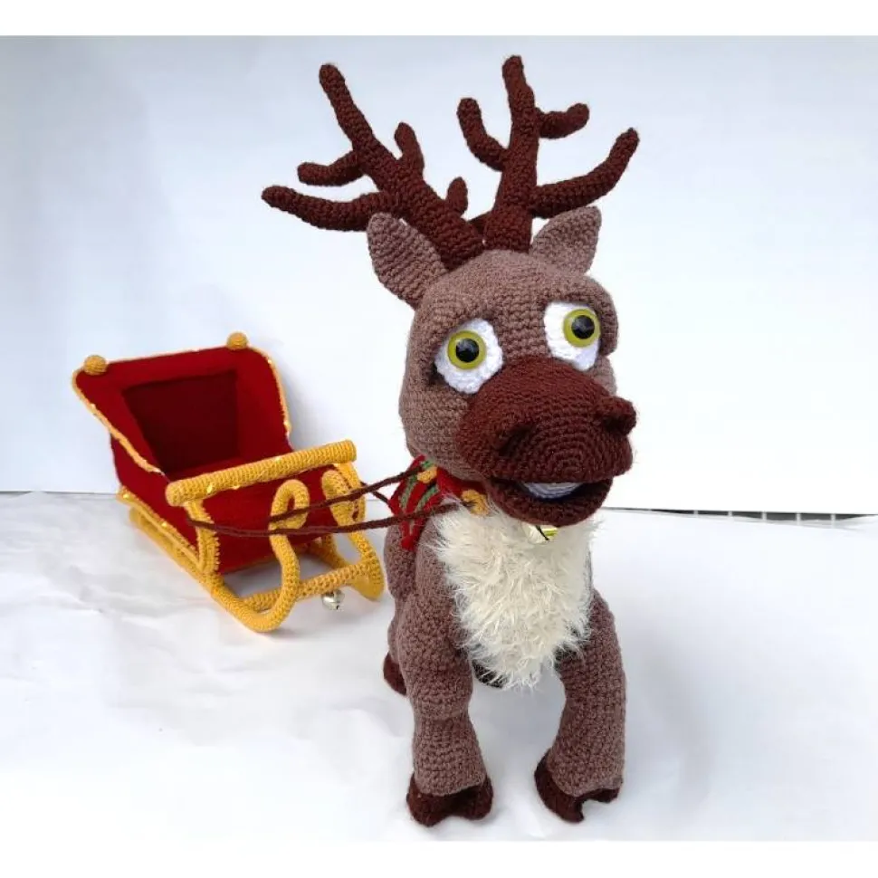 Das knuffige Rentier wird ca. 40×28 cm groß, der Schlitten dazu ca. 33×23 cm. Eine Micro-Lichterkette beleuchtet den dunkelroten/goldfarbenen Schlitten und sorgt für stimmungsvolle Akzente.