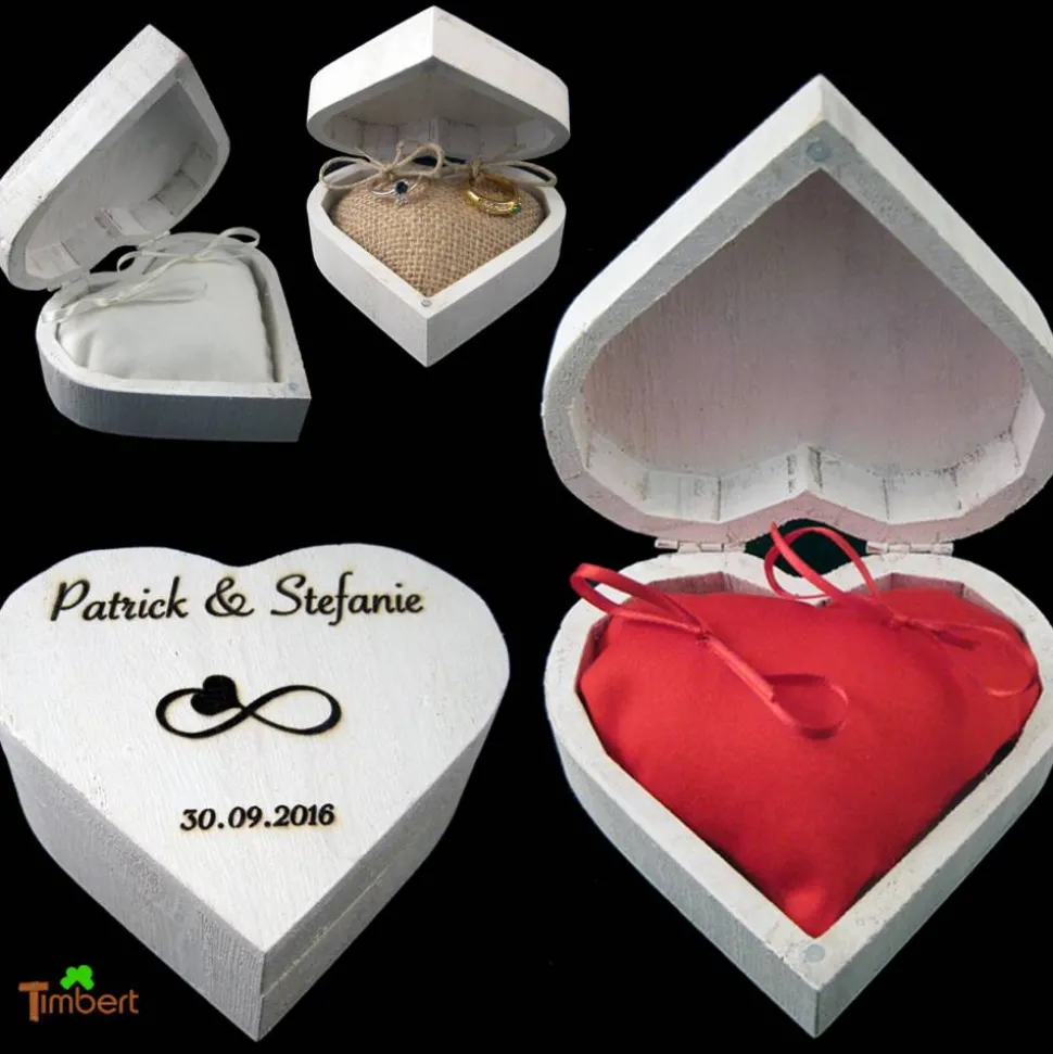 Das Ringkissen ist aus hochwertiger Baumwolle oder Jutestoff genäht und in 3 Farben bestellbar (rot, weiß und Natur (Jute). Die Ringen können ganz praktisch an den Satin- oder Jutebändern festgebunden werden. Die Vornamen und das Hochzeitsdatum werden nach Wünsch -wie auf den Bilder- stilvoll im Holzbox eingraviert.
