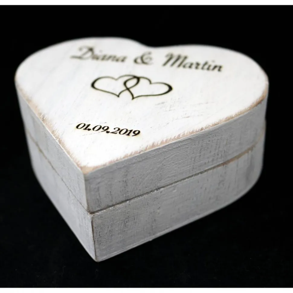 Die Vornamen und das Hochzeitsdatum werden nach Wünsch -wie auf den Bilder- stilvoll auf der Holzbox eingraviert.