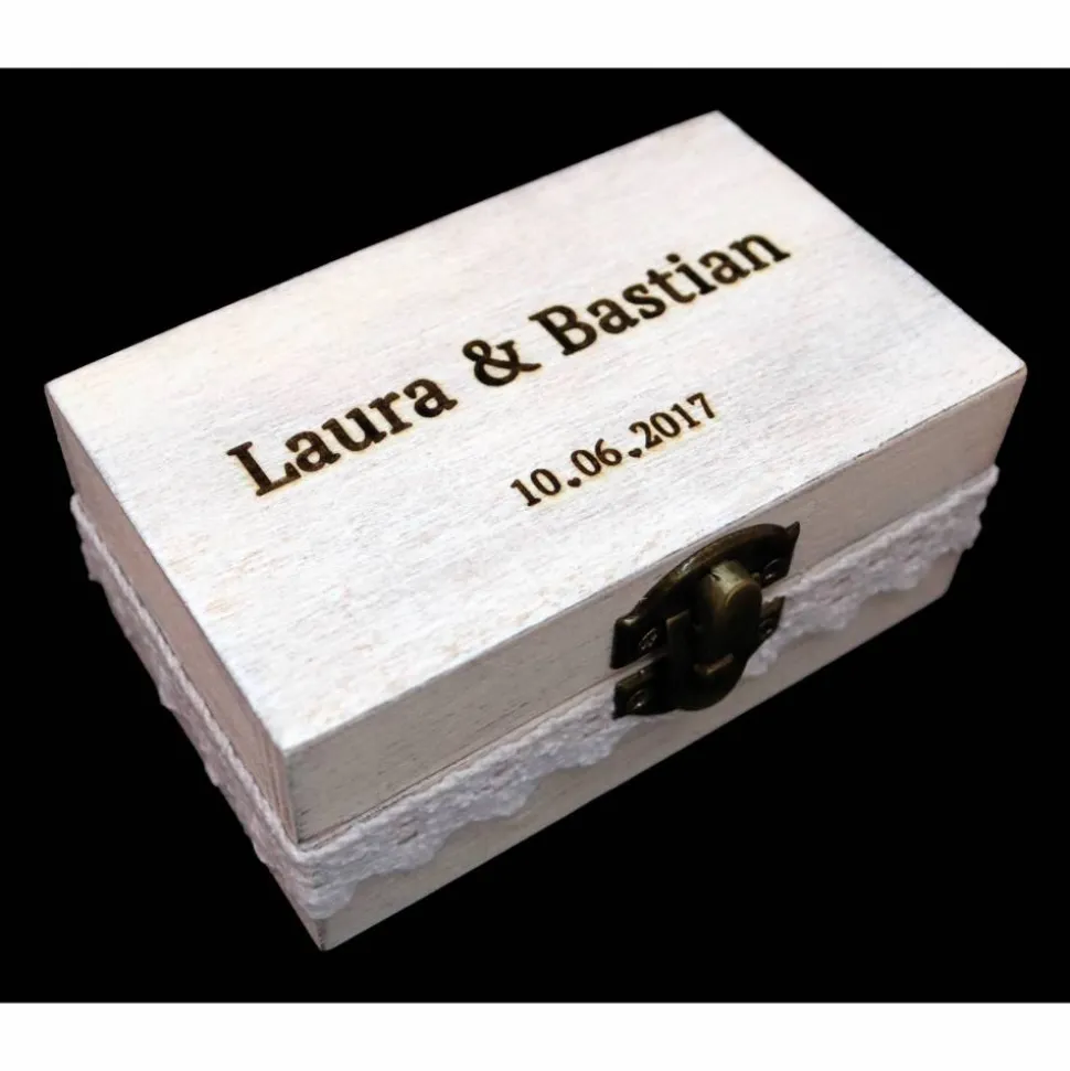 Die Vornamen und das Hochzeitsdatum werden nach Wünsch -wie auf den Bilder- stilvoll auf der Holzbox eingraviert.