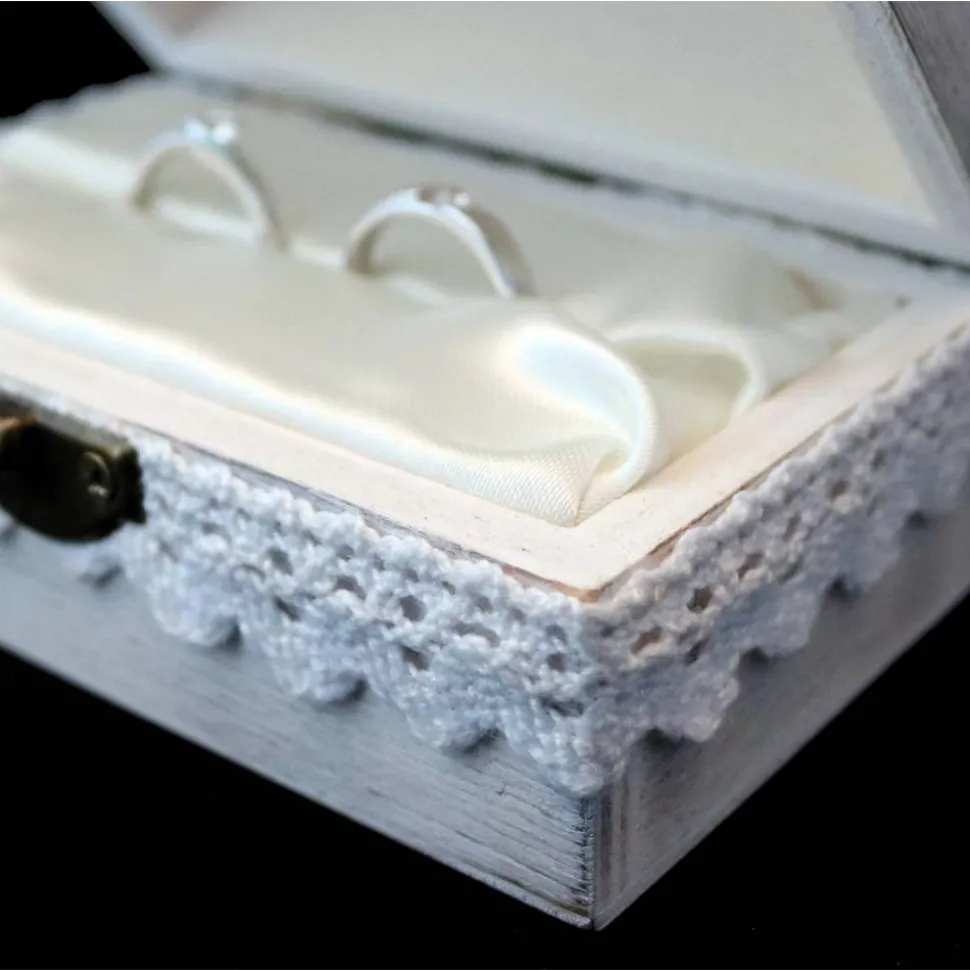 Holzbox aus Pinienholz, Ringkissen aus Satin, Spitzenband