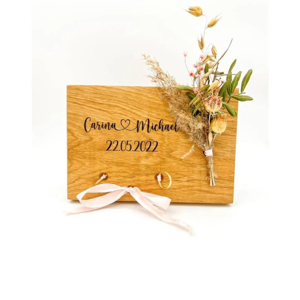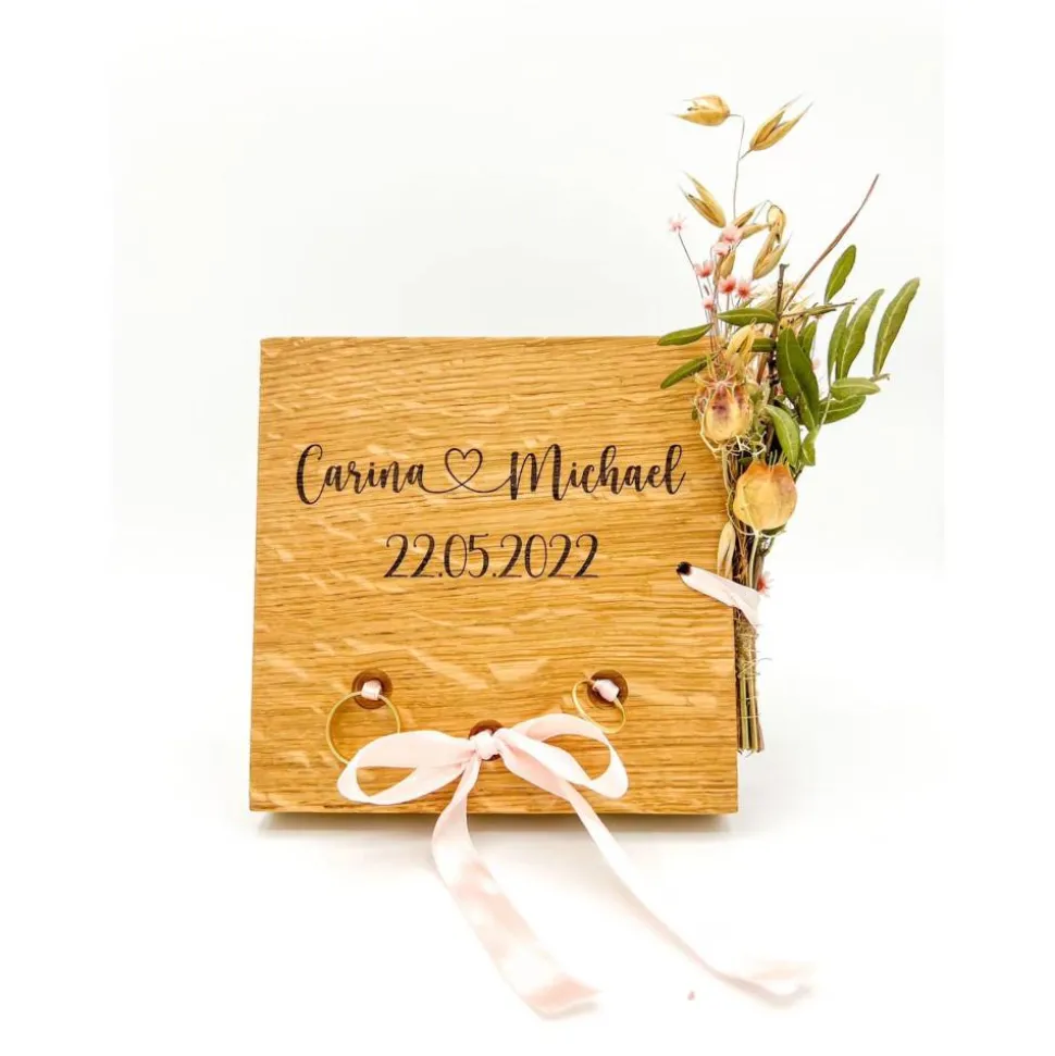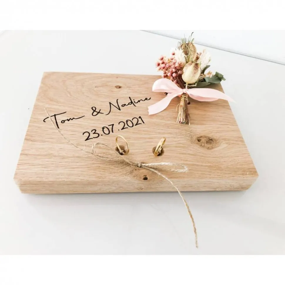 Unser Ringbrett fertigen wir aus hochwertigem massivem Eichenholz. Mit Hilfe von 4 dezenten Bohrungen könnt Ihr sowohl die Ringe als auch die Blumendekoration befestigen.
