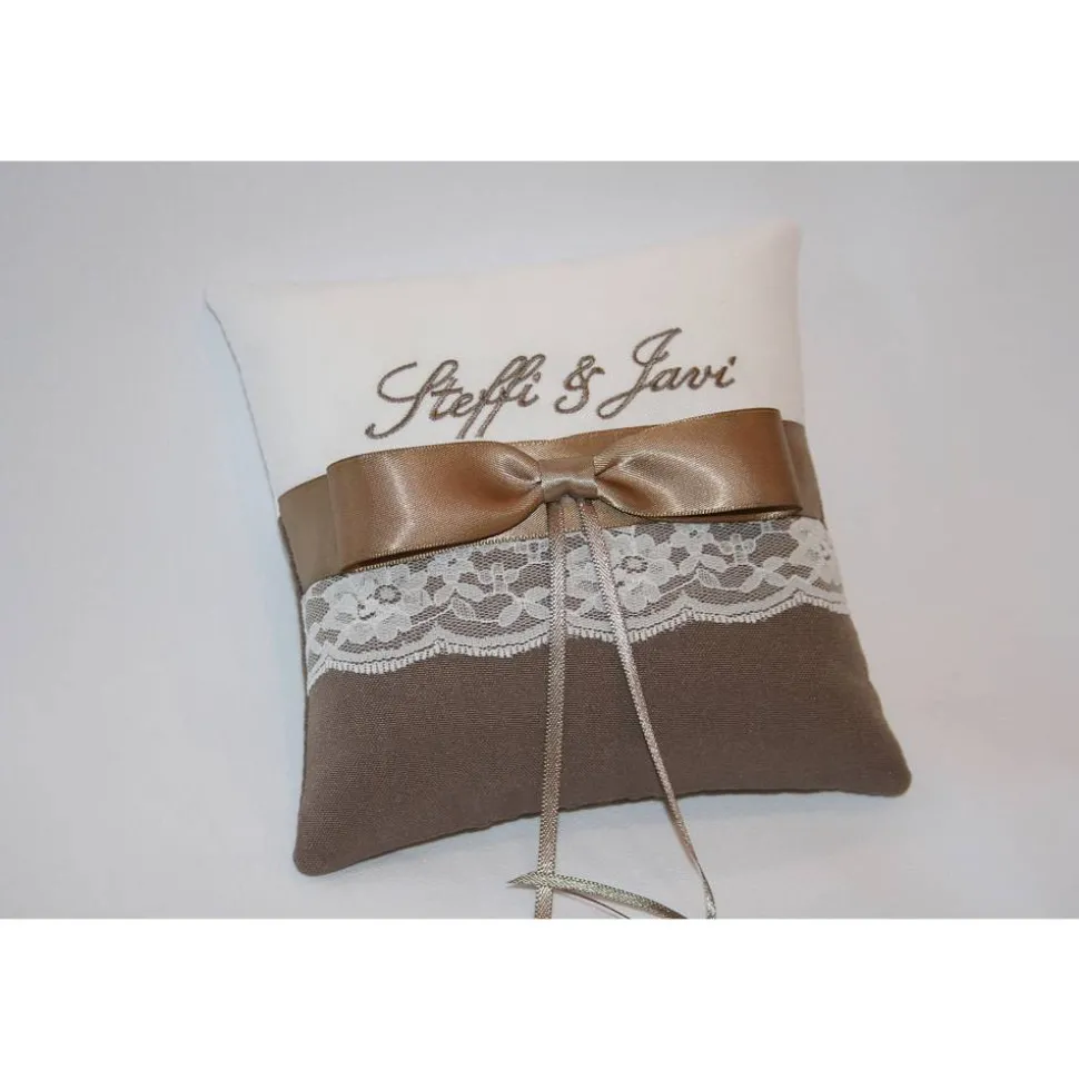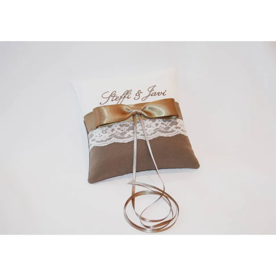 Das Ringkissen ist in Weiß und Taupe gearbeitet, mit Spitze und Satinband verziert. Die Satinbänder (3mm) halten die Trauringe.