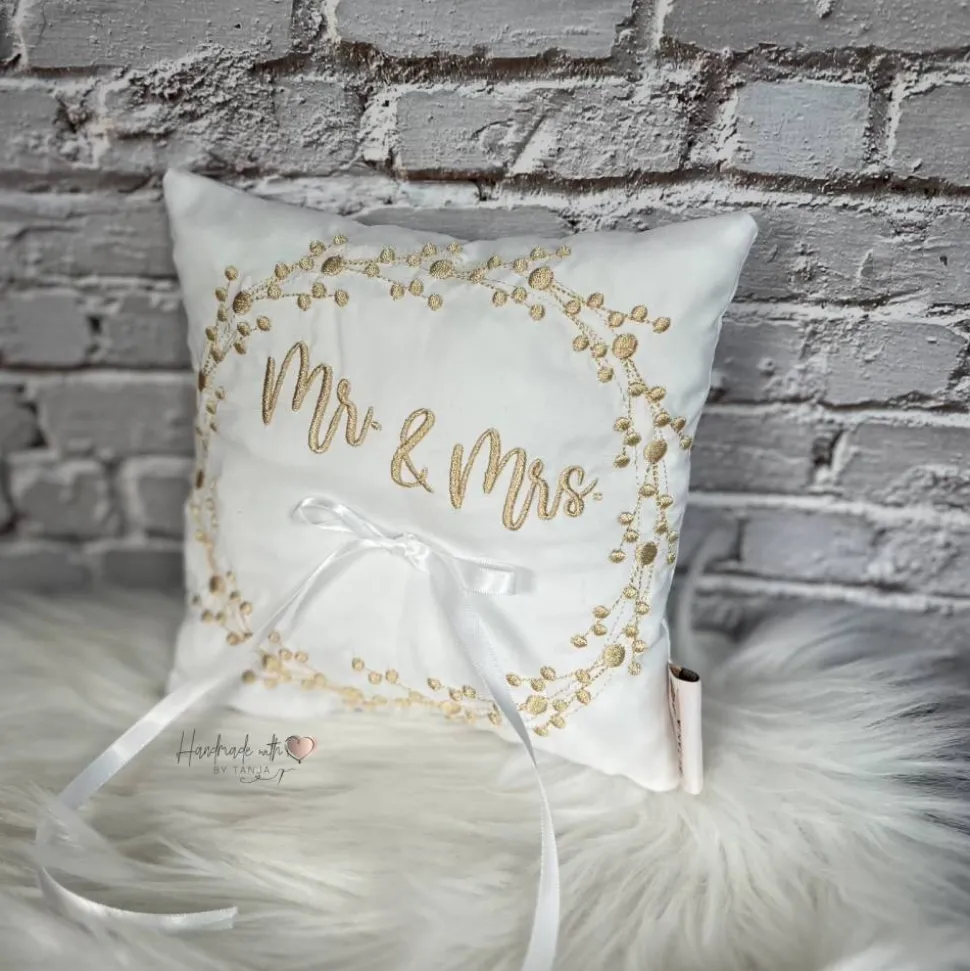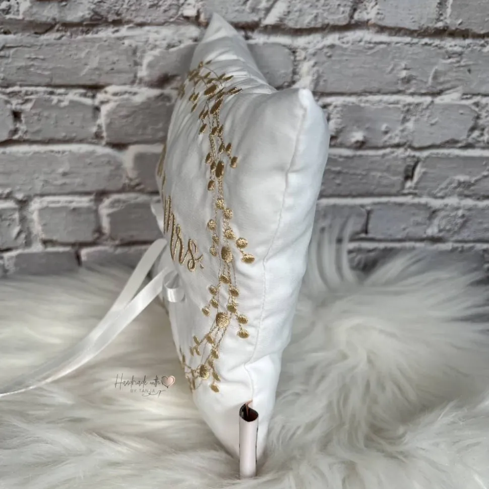 Dieses wunderschöne Ringkissen ist der perfekte Begleiter für den schönsten Tag im Leben. Das Kissen ist aus hochwertigem Stoff gefertigt. In die Mitte habe ich eine Satinschleife befestigt. Dort finden die Eheringe ihren Platz und können dort am besten mit einem leichten Knoten befestigt werden.