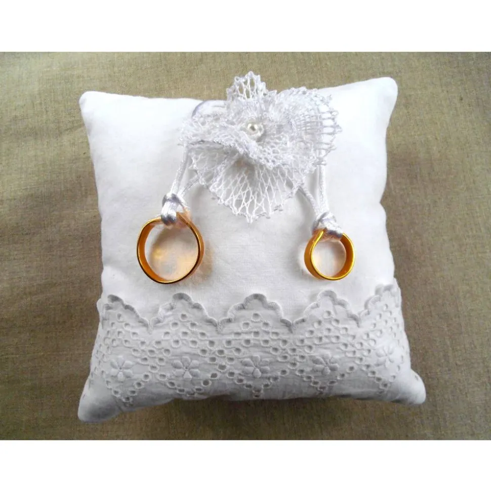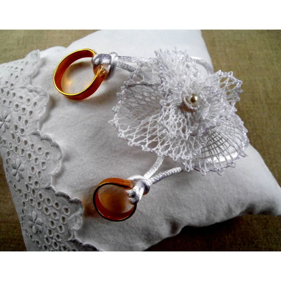 Die Blüte und die Bänder für die Ringe habe ich von Hand auf das Kissen aufgenäht. Die Ringe auf dem Foto sind aus gebogenem Aluminiumdraht und dienen nur zur Dekoration, gehören also nicht zum Lieferumfang.