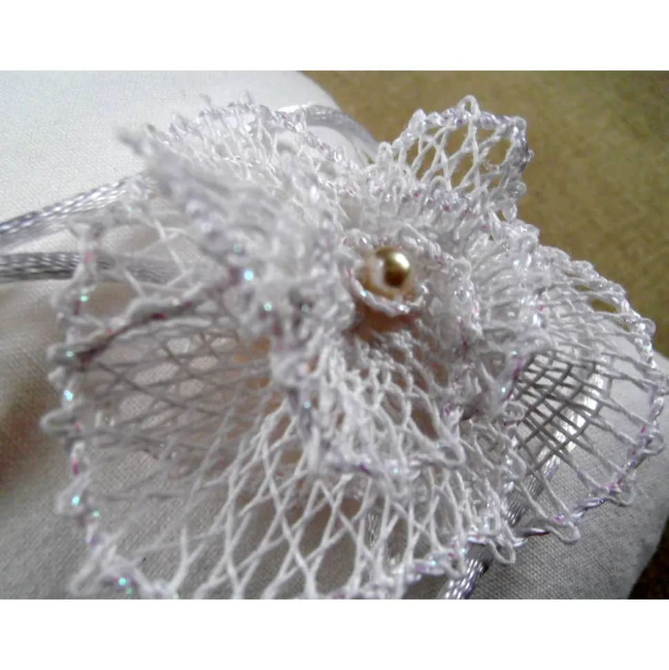 Die Blüte habe ich nach einem eigenen Entwurf aus weißem Baumwollgarn und weißem Viskosegarn von Hand geklöppelt.