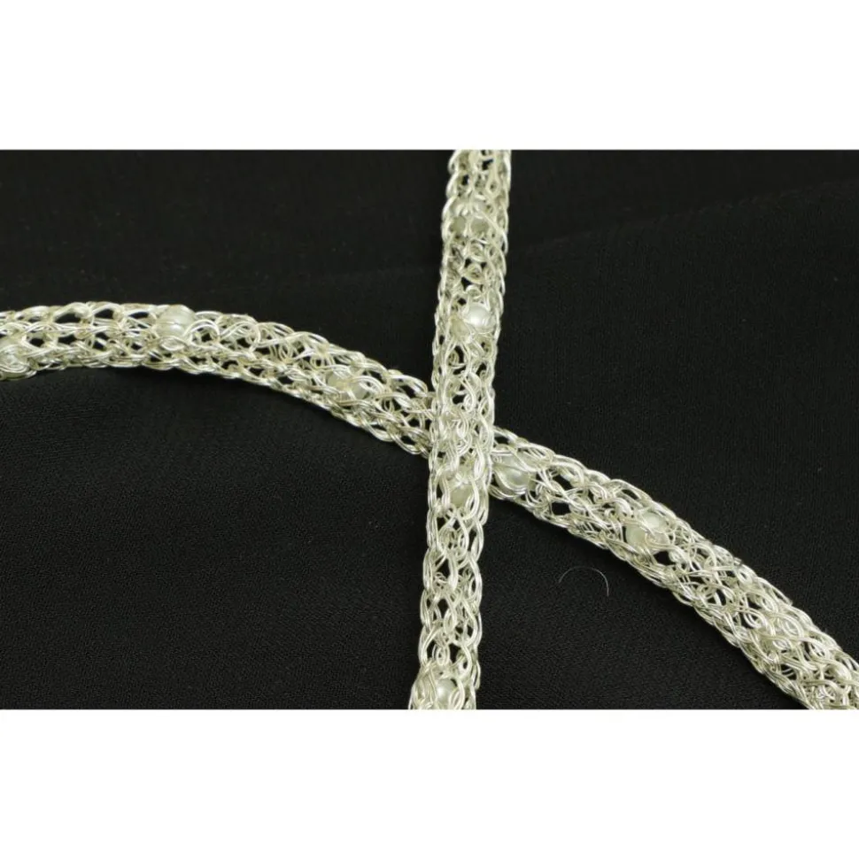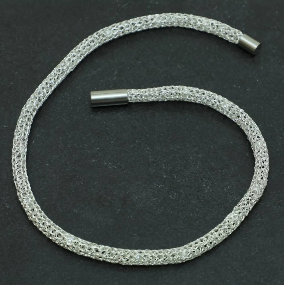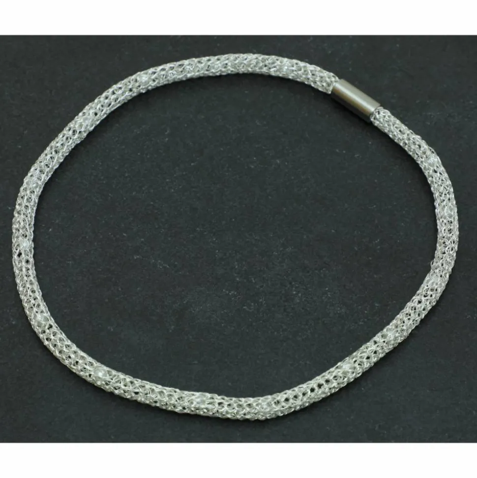 Dieses Collier aus zartem lackiertem Silberdraht verleiht jeder Trägerin einen ganz eigenen Charme und ihrem Look Leichtigkeit. Eyecatcher sind die über die gesamte Länge eingearbeiteten kleinen weißen Wachsperlen. Gerade auf einem dunklen Untergrund kommt der Schmuck besonderes zur Geltung. Romantisch und elegant zum Beispiel als Geschenk zum Valentinstag.