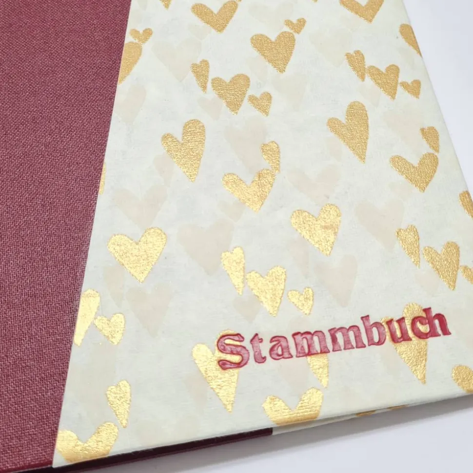 Das Stammbuch habe ich aus Buchbinderpappe gefertigt. Am Rücken ist es mit abgeschrägtem dunkelrotem Buckram Buchbinderleinen überzogen. Das Überzugspapier ist handgeschöpftes Naturpapier aus Baumwolle „Indian Style“. Es hat eine schöne samtig weiche Oberfläche. Die gold und cremefarbenen Herzchen sind nicht nur sichtbar, sondern auch fühlbar, sie sind leicht erhaben.