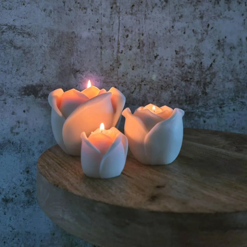 Die zarten Formen und die handwerkliche Raffinesse dieser Rosenkerzen lassen sie zu einem Blickfang in jedem Raum werden.