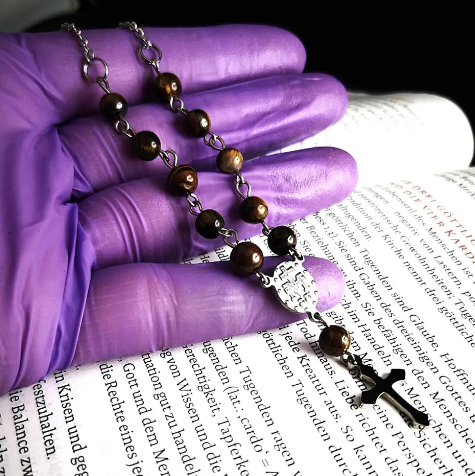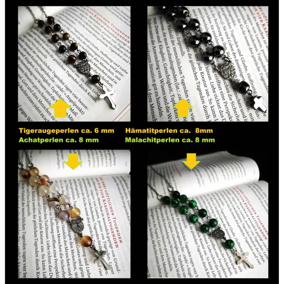 Die Rosenkranz-Halskette überzeugt durch ihre edle Basis aus Edelstahl und ist in vier Ausführungen erhältlich. Auf jeder Seite sind fünf Steinperlen aus Hämatit, synthetischem Malachit, Achat oder Tigerauge verarbeitet. Im Mittelpunkt steht ein beidseitig verziertes Herzstück, ergänzt durch eine gewählte Steinperle sowie ein kleines Kreuz. Die Kette aus Hämatitperlen wird standardmäßig mit einem Hämatitkreuz geliefert, kann auf Wunsch jedoch auch mit einem kleinen Edelstahlkreuz angefertigt werden.