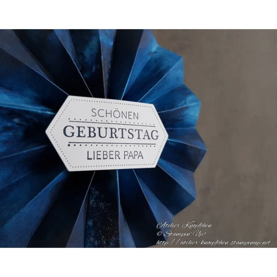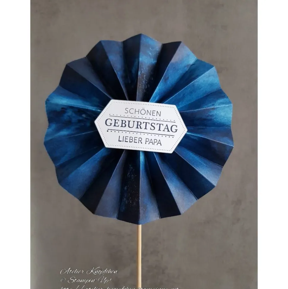 Neben dem Textstempel „Schönen Geburtstag lieber Papa“ zählen hierzu Designerpapier, Farbkarton in Flüsterweiß sowie Stempelfarbe in Marineblau.