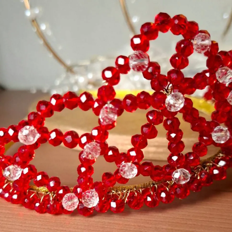 Entfalte deine innere Königin mit der handgefertigten Krone aus roten Perlen von Scent of Beauty Design. Dieses edle Diadem strahlt in intensivem Rubinrot, veredelt durch funkelnde Kristallakzente, die im Licht magisch leuchten. Jede Krone wird mit Liebe, Geduld und einem Hauch Magie gefertigt und besticht durch ihre einzigartige Qualität.