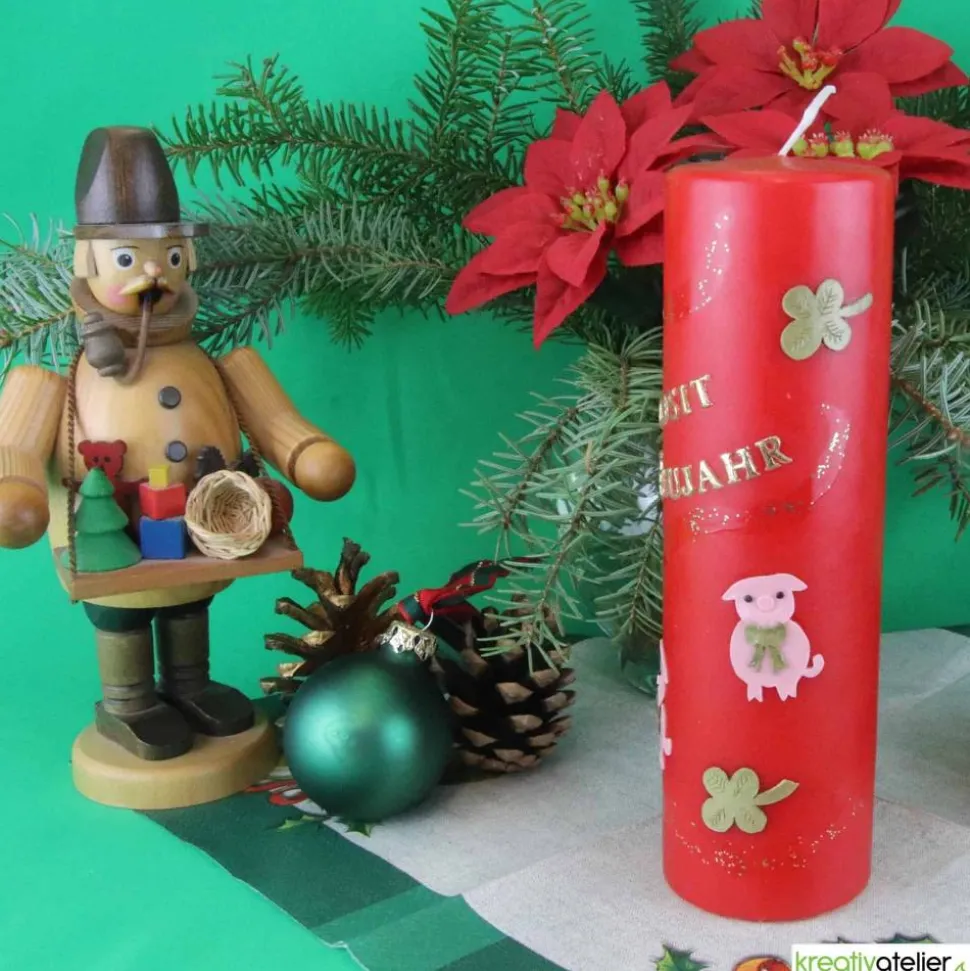 Alle Ornamente werden einzeln von Hand aus verschiedenen Wachsplatten ausgeschnitten und auf der Kerze kunstvoll zu einem Gesamtbild arrangiert. Die Silvesterkerze eignet sich hervorragend als Mitbringsel zur Silvesterparty oder zum Neujahrsfest. Auf der Rückseite können Sie einen persönlichen Neujahrsgruß schreiben lassen. Bitte teilen Sie mir dazu Ihren Wunschtext, Namen oder Datum mit.