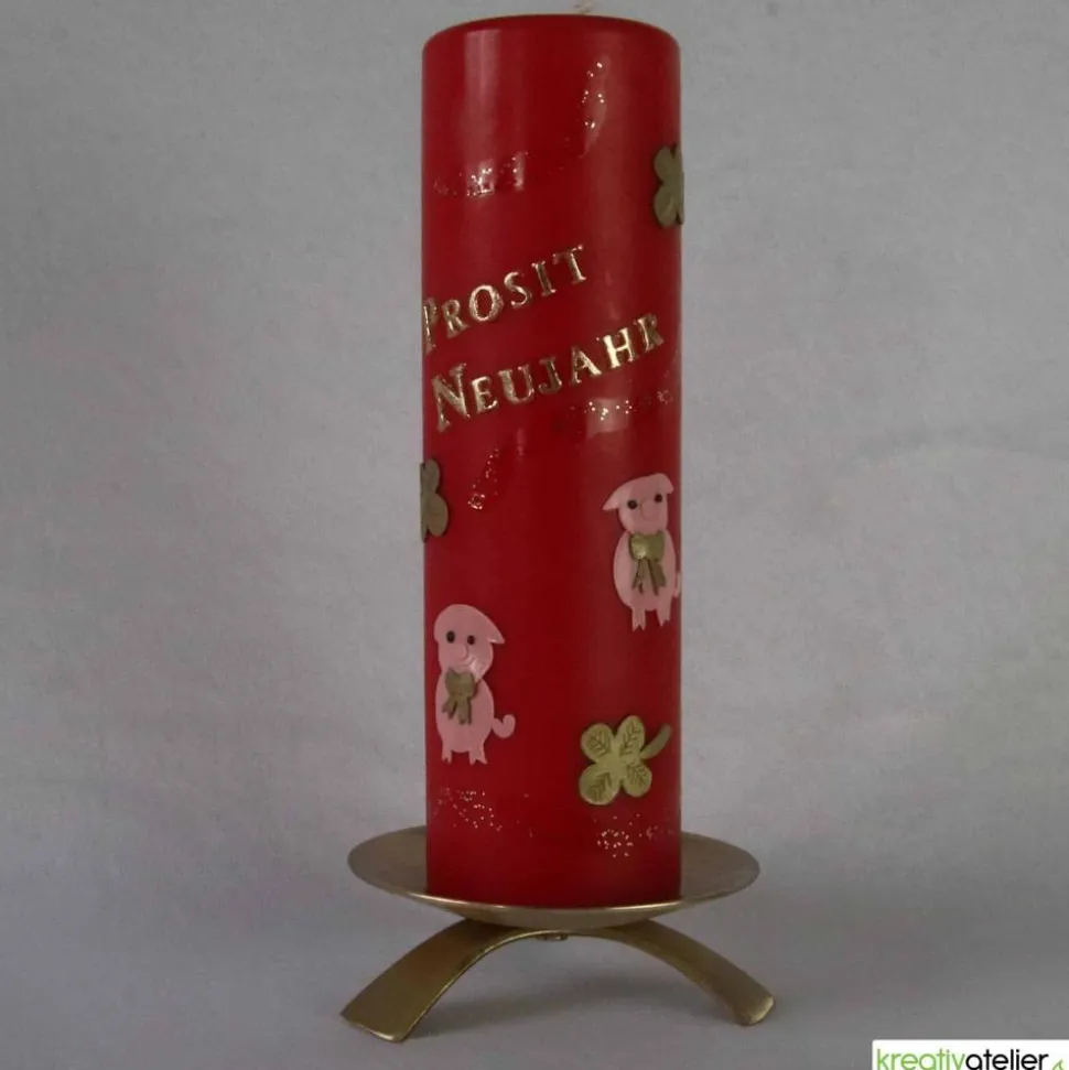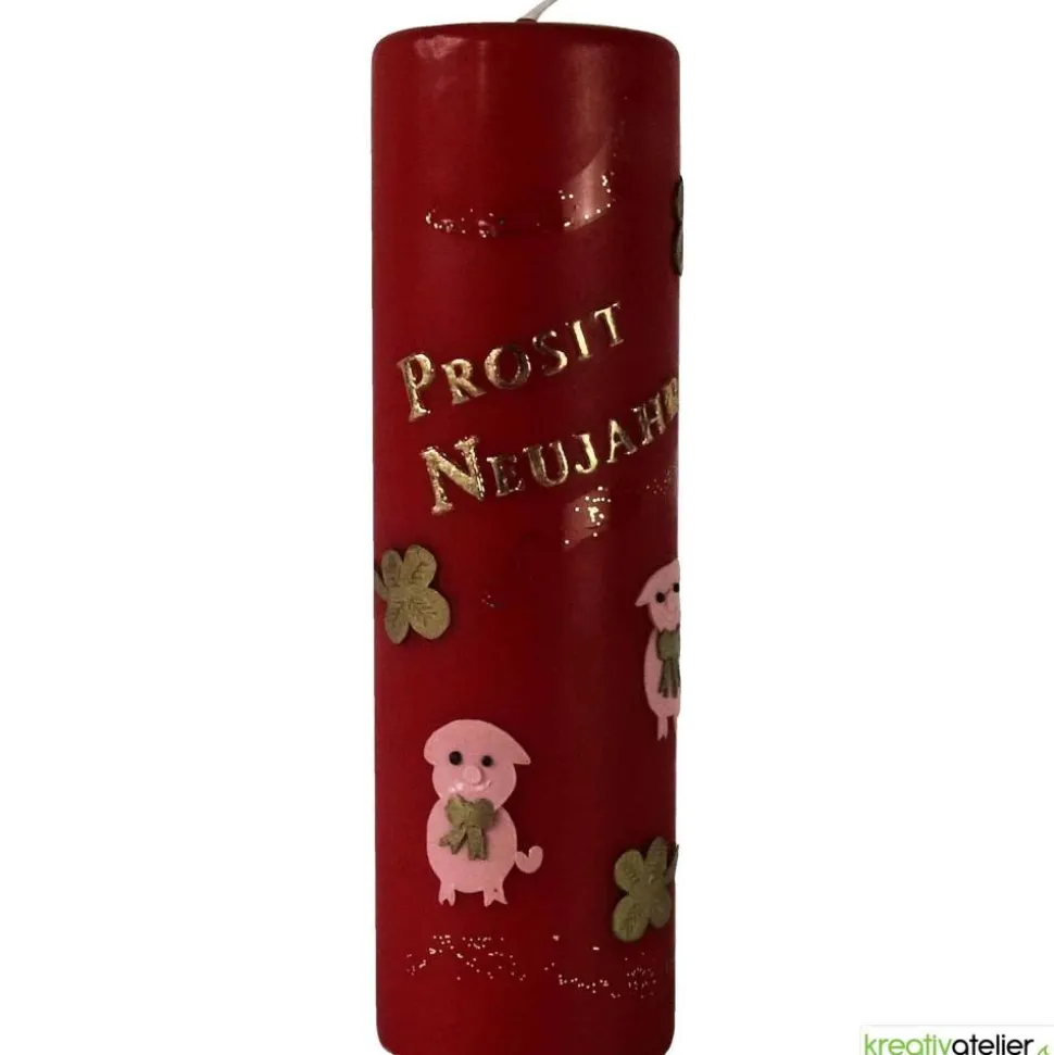 Meine Silvesterkerzen werden aufwändig von Hand mit Wachs verziert. Die beiden niedlichen Schweinchen sollen viel Glück im neuen Jahr bringen. Auch die goldenen Kleeblätter sind Glückssymbole. Der goldene Schriftzug „Prosit Neujahr“ ist fester Bestandteil der Kerze.