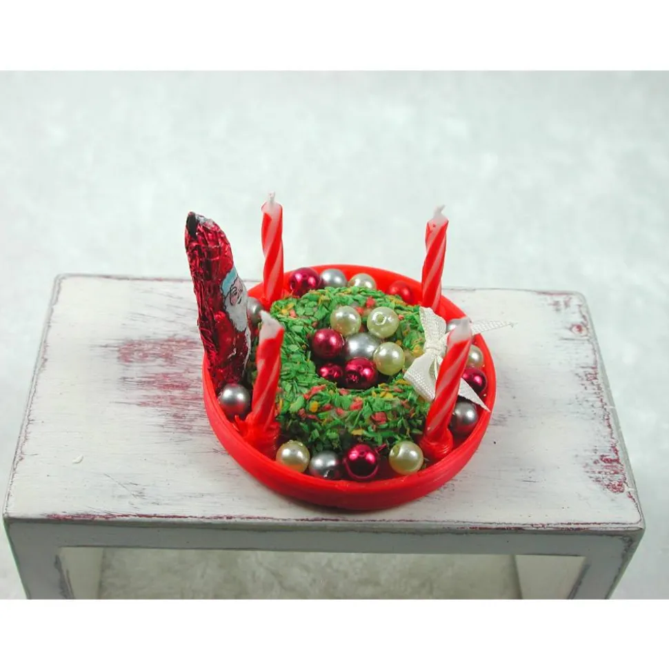 Im Teller liegt ein grüner Kranz und der Teller ist reichlich individuell dekoriert.