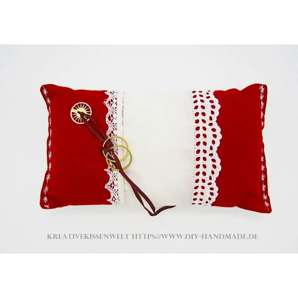 Mach Deine Trauung unvergesslich mit diesem liebevoll handgemachten Ringkissen von KreativeKissenwelt. Auf feinem roten Baumwollstoff wurden mittig zwei verschiedene Baumwollspitzen kunstvoll aufgenäht und sorgen für eine romantische, elegante Optik.