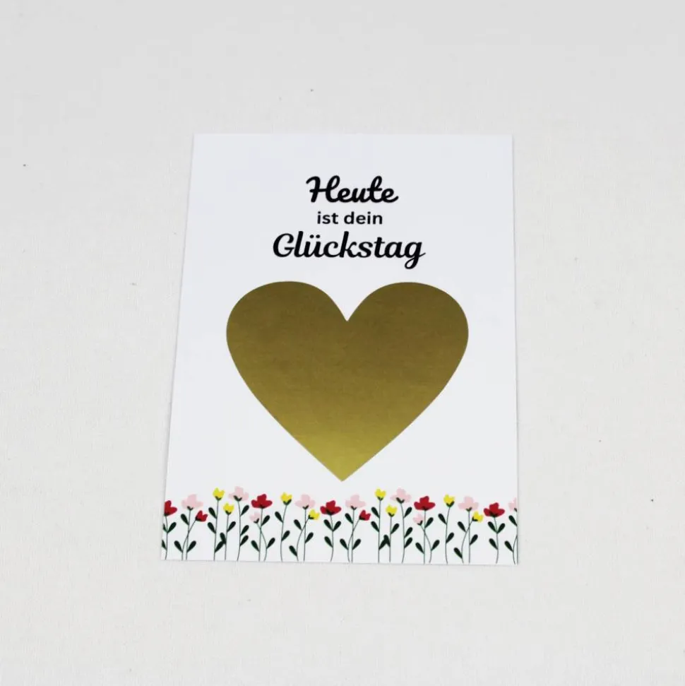 Diese Rubbelkarte ist zum Selberbeschreiben. Du kriegst das goldene Herz zum Rubbeln extra getrennt und kannst es selbst auf die Nachricht bekleben.