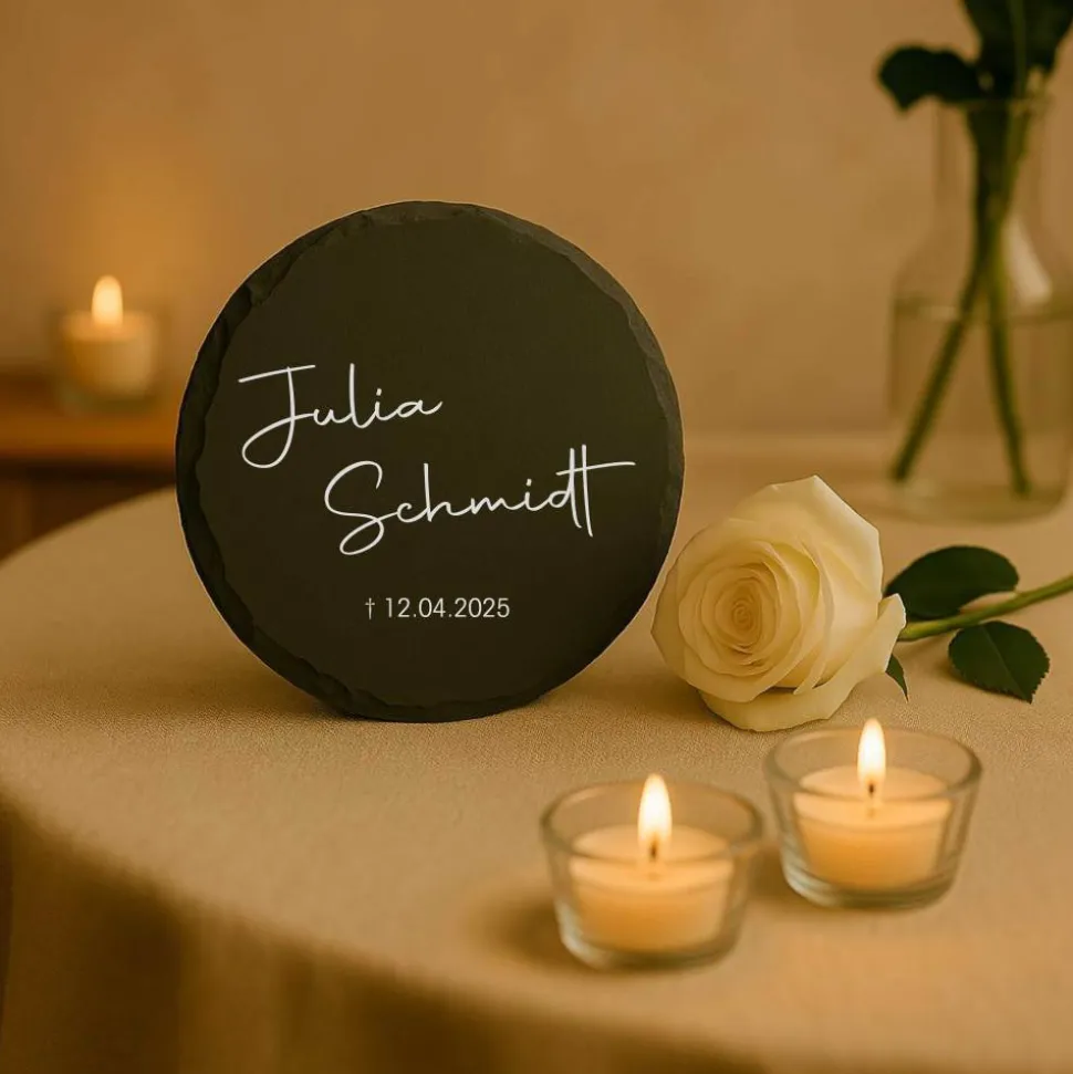 Setze ein liebevolles Andenken mit einer individuell gravierten Schiefertafel in runder Form. Diese handgefertigte Gedenktafel besteht aus hochwertigem Schiefer, der in Deutschland produziert und von einem kleinen Familienunternehmen bezogen wird. Jede Schiefertafel ist ein Unikat, geprägt durch natürliche Farbunterschiede, Einschlüsse und kleine Unebenheiten – so wird dein Erinnerungsstück einzigartig.