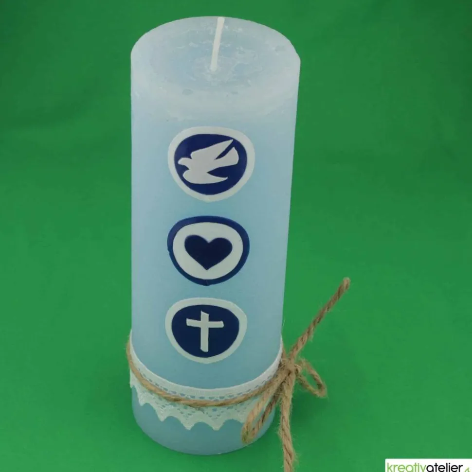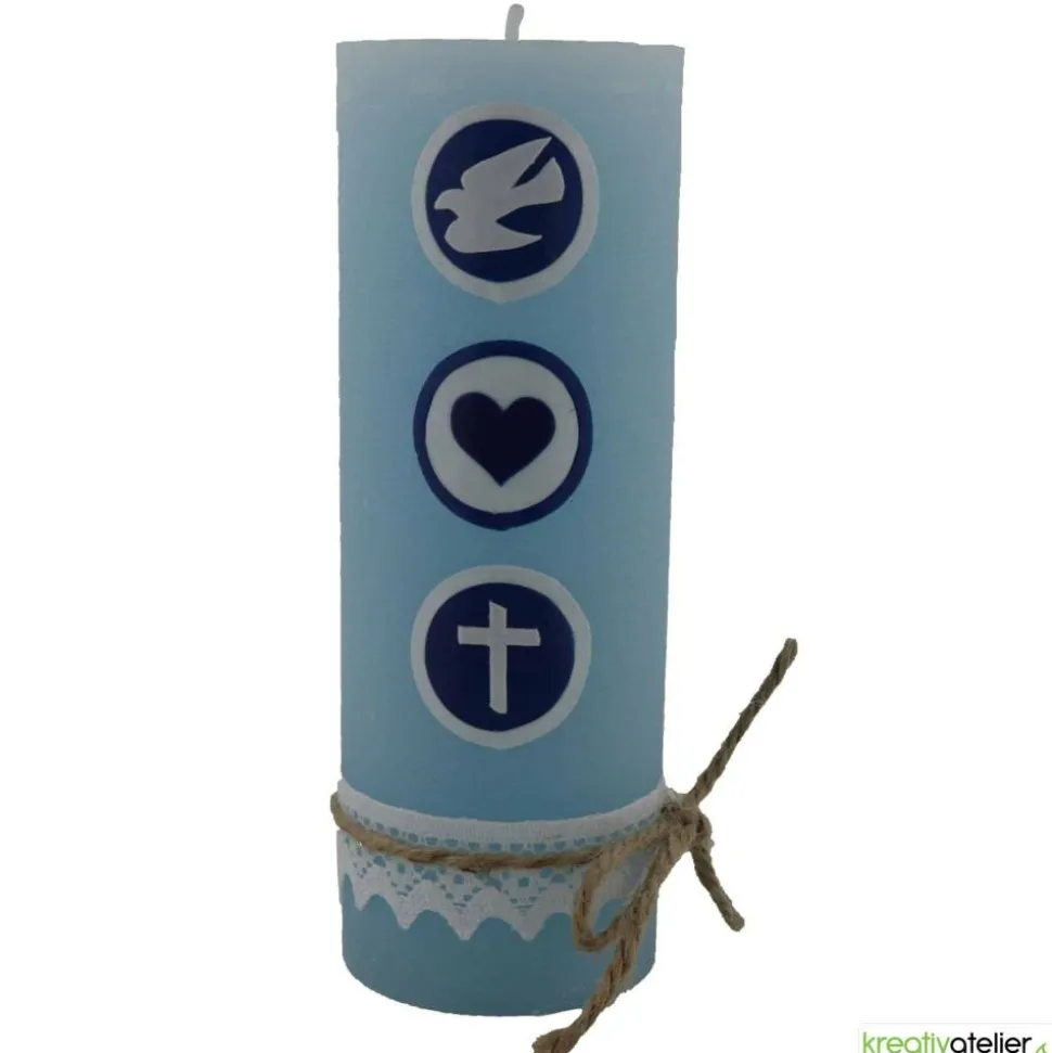 Hergestellt in meinem Atelier, werden ausschließlich Qualitätskerzen verwendet, die in Deutschland nach traditionellen Verfahren hergestellt werden. Die Kerze ist 190 mm hoch, hat einen Durchmesser von 68 mm und brennt ca. 85 Stunden. Diese Geburtskerze ist auch in Rosa erhältlich, mit den Verzierungen „Glaube, Liebe, Hoffnung“ in Weinrot und Weiß, was sie zu einer perfekten Wahl für Jungen und Mädchen macht. Sie schenkt dem Neuankömmling Licht und Wärme und vermittelt die Botschaft „Du bist willkommen“.