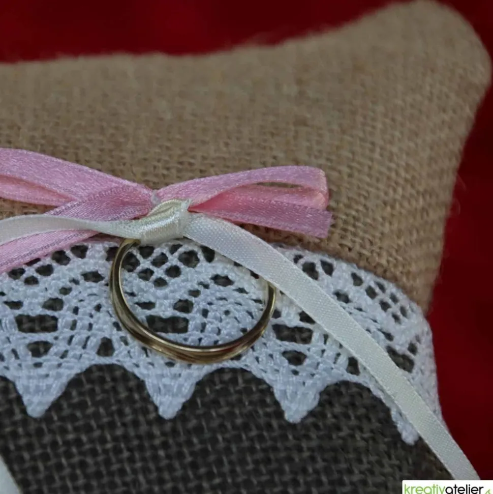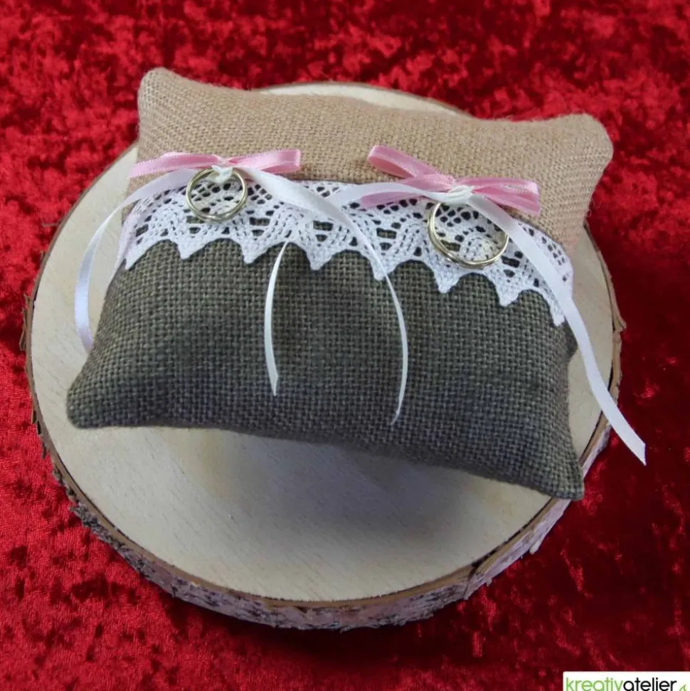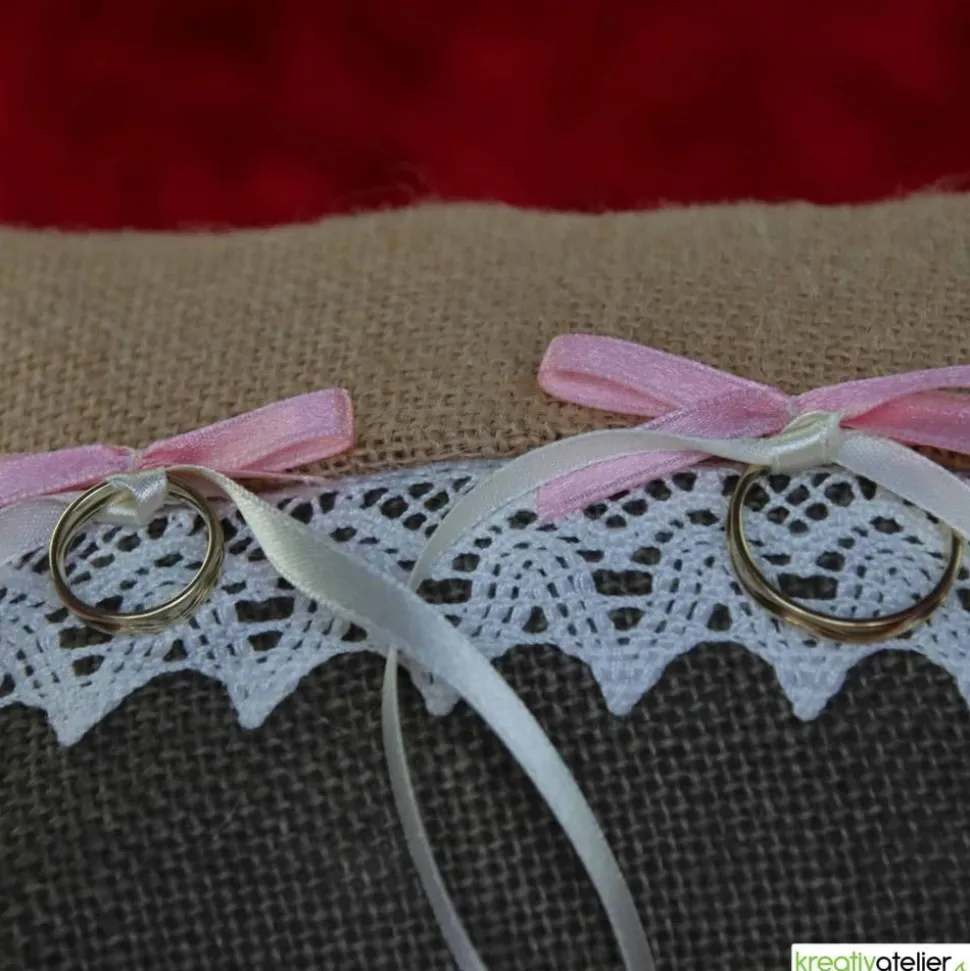 Das Kissen zeichnet sich durch seine Klöppelspitze aus, die eine charakteristische Grenze zwischen dem helleren und dunkleren Jutestoff bildet. Diese Spitze verleiht dem sonst rustikalen und natürlichen Material eine feine und edle Note. Die Satinschleifen, die im Kontrast zum Jutestoff stehen, bringen eine zarte Eleganz in das Design und unterstreichen die Bedeutung der darauf präsentierten Ringe.