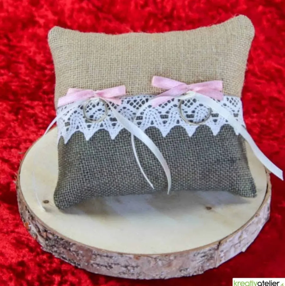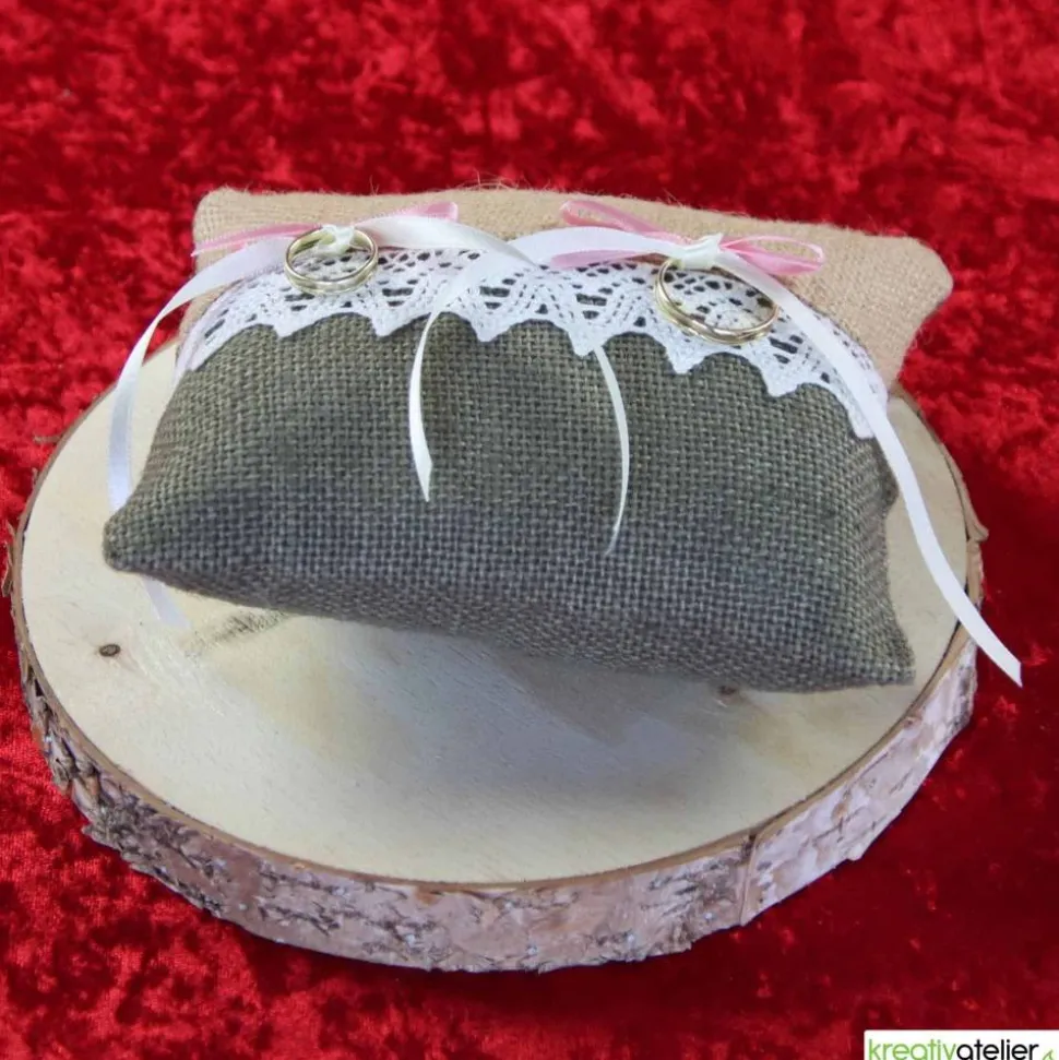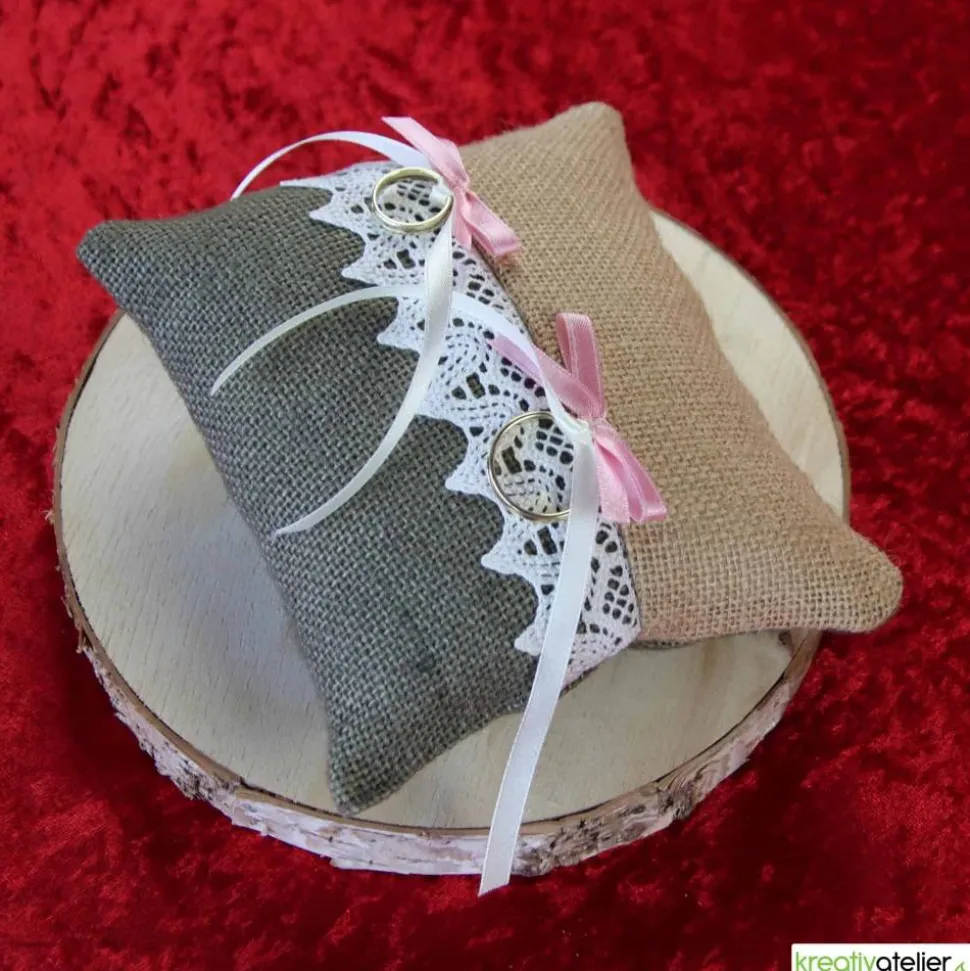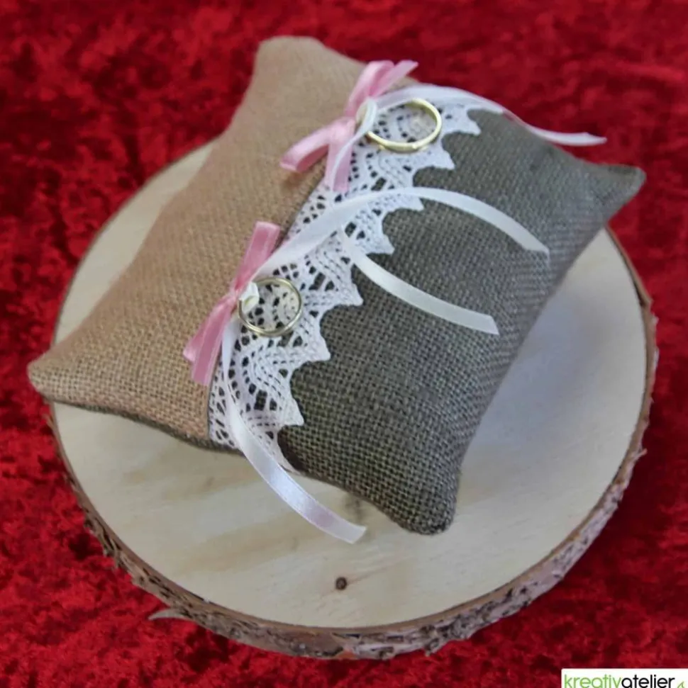 Das Kissen zeichnet sich durch seine Klöppelspitze aus, die eine charakteristische Grenze zwischen dem helleren und dunkleren Jutestoff bildet. Diese Spitze verleiht dem sonst rustikalen und natürlichen Material eine feine und edle Note. Die Satinschleifen, die im Kontrast zum Jutestoff stehen, bringen eine zarte Eleganz in das Design und unterstreichen die Bedeutung der darauf präsentierten Ringe.