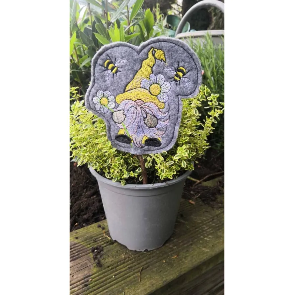 Der Blumenstecker ist aus Polyesterfilz und mit Polyestergarn bestickt. Das Motiv ist ein Gnom mit Bienen.