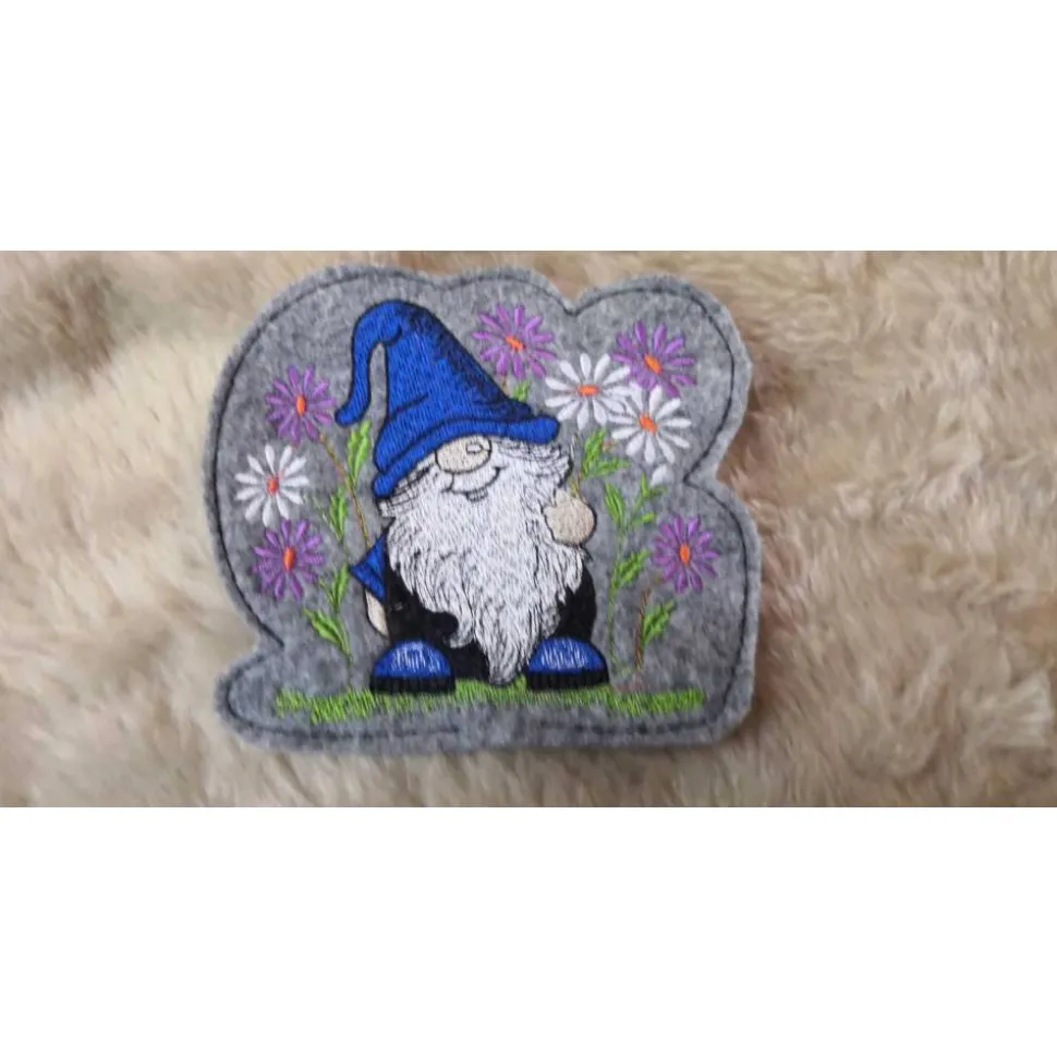 Der Blumenstecker ist aus Polyesterfilz und mit Polyestergarn bestickt. Das Motiv ist ein Gnom mit Blumen