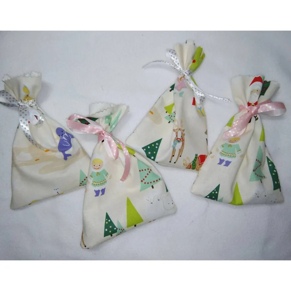 4 kleine Sackerl aus Baumwollstoff genäht .